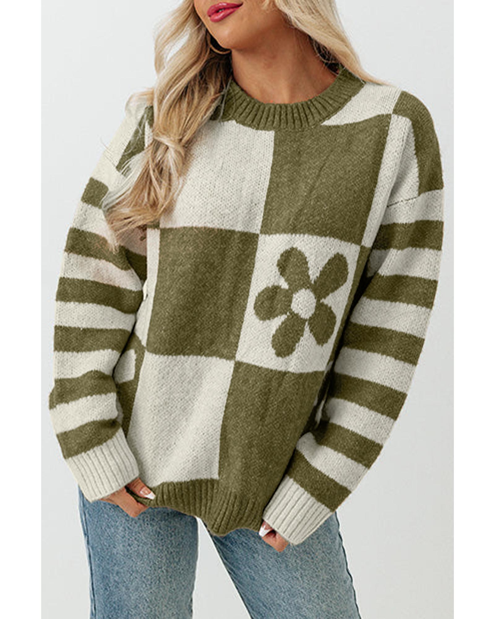 Green Checkered Floral Print Striped Sleeve Sweater – S
