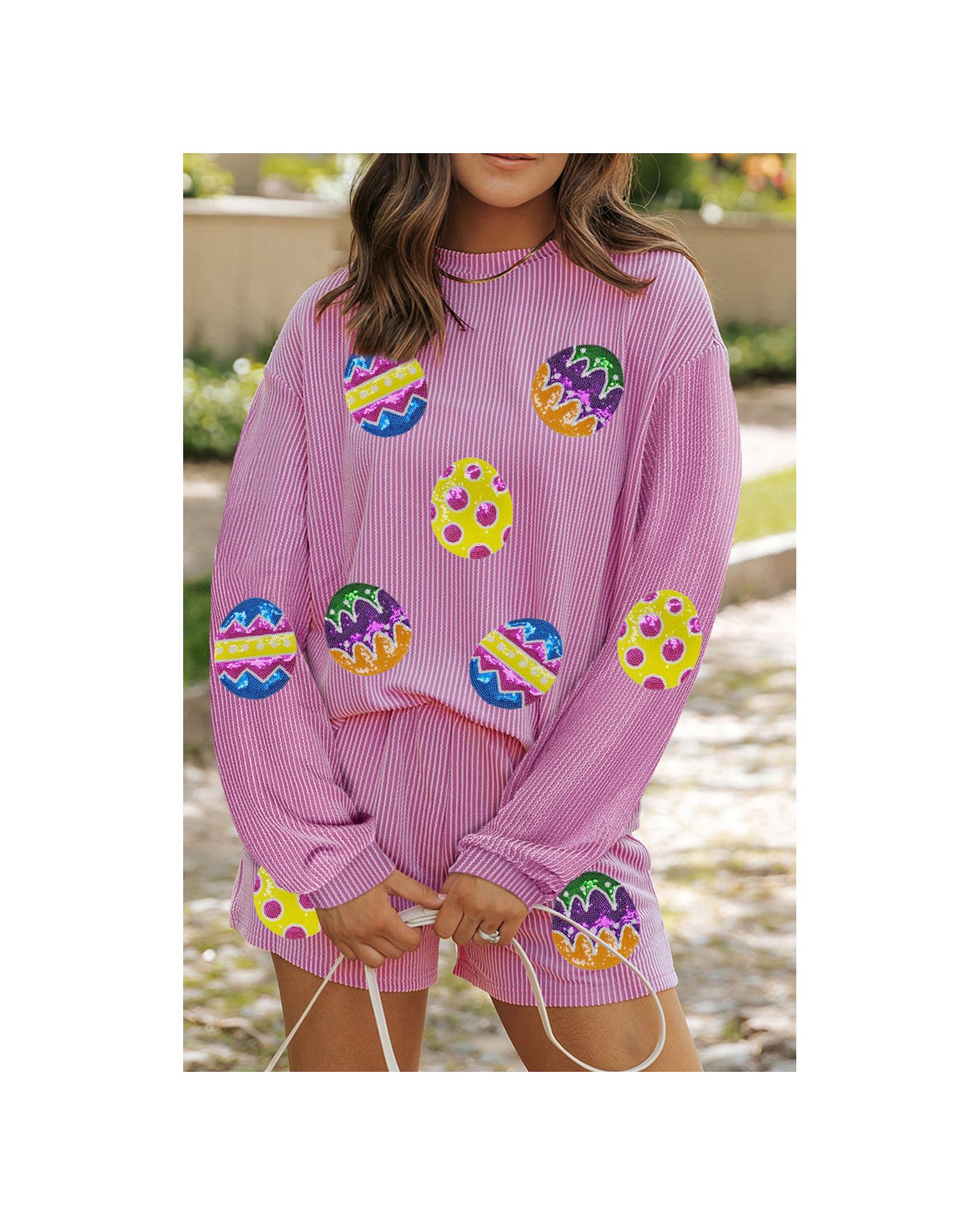 Phalaenopsis Easter Egg Patched Graphic Corded Long Sleeve Top Shorts Set – S