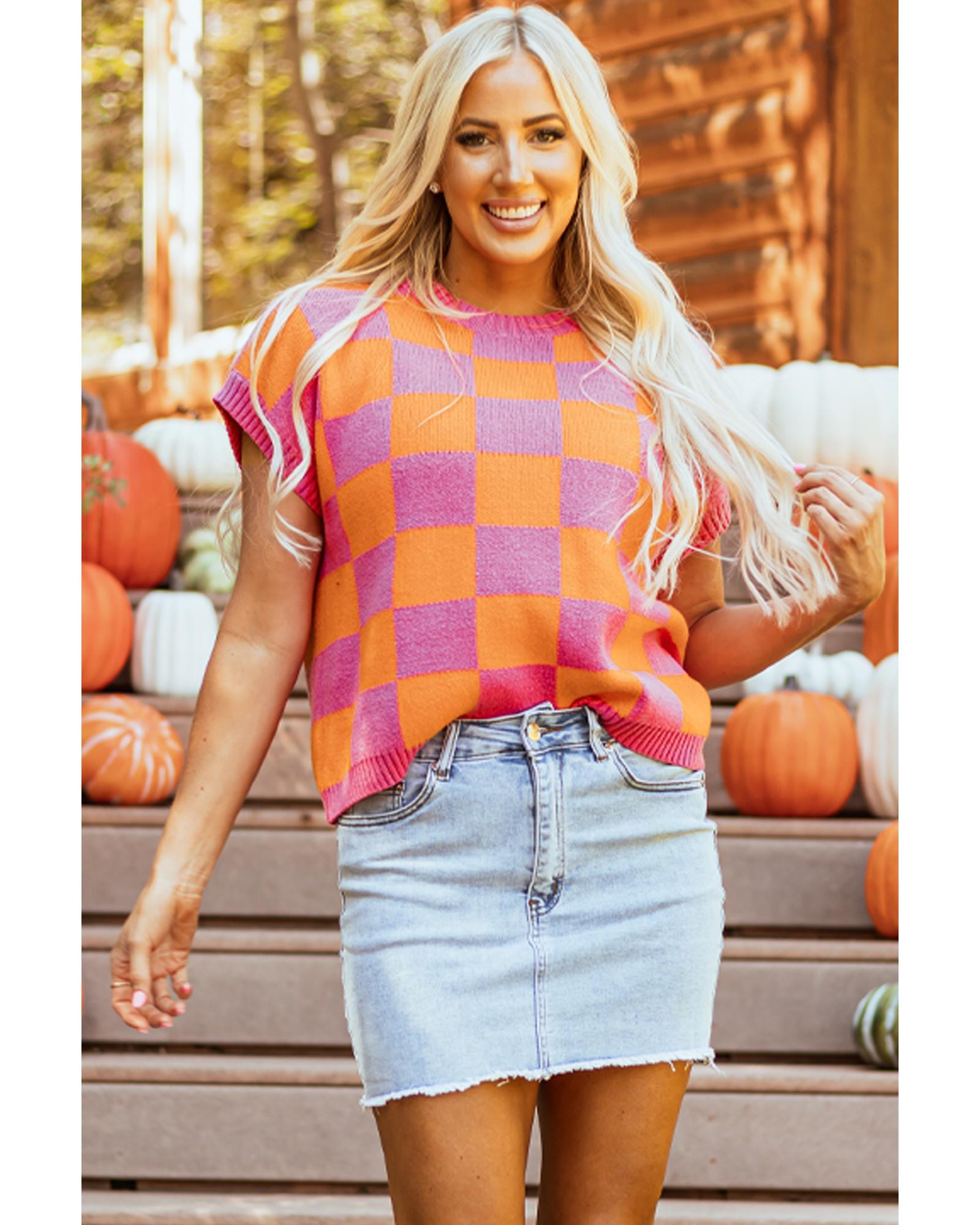 Strawberry Pink Colorblock Plaid Pattern Ribbed Trim Sweater Tank Top – L