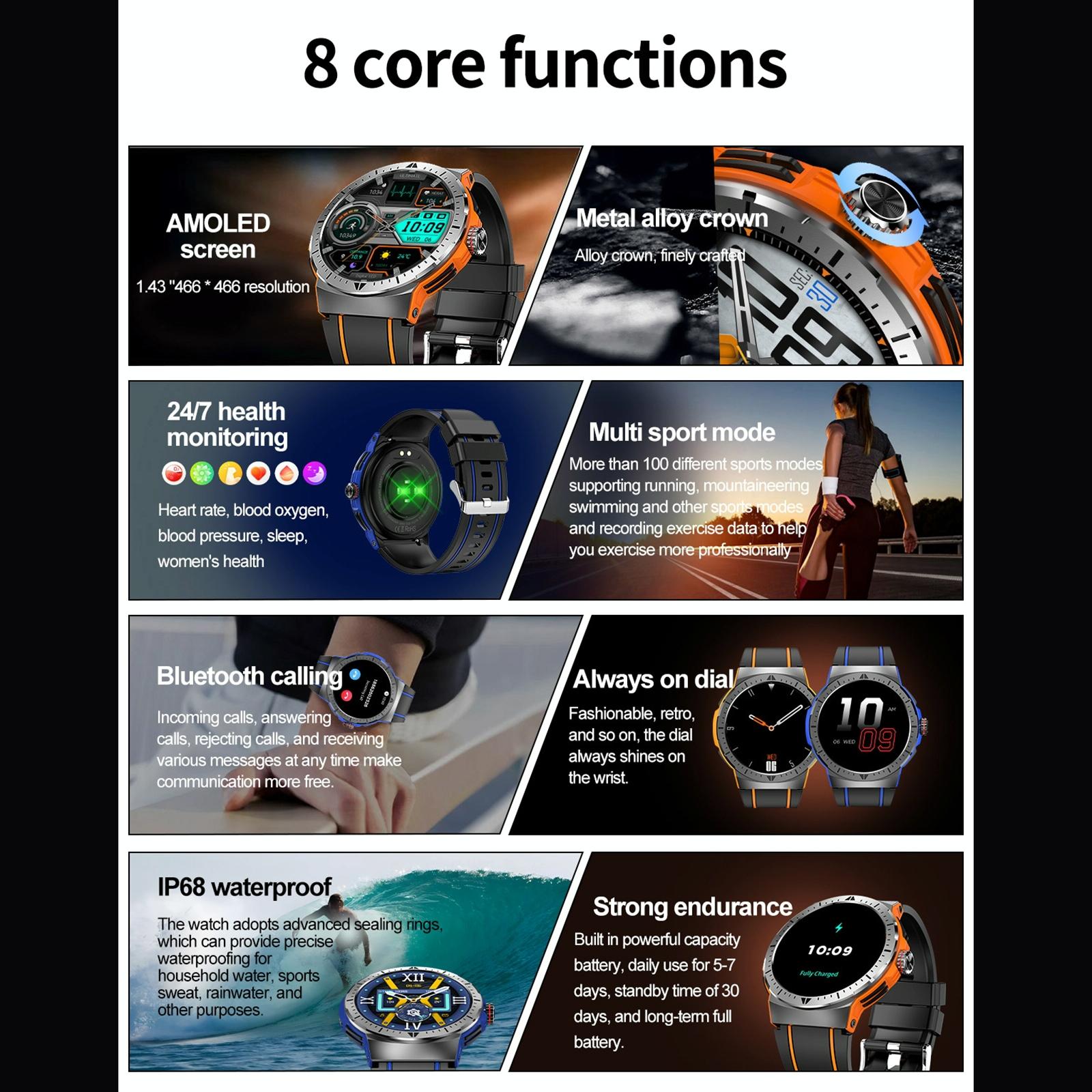 • 1 x 1.43 Inch Bt5.3 Ip68 Sport Smart Watch Bluetooth Call / Message / Health Monitor