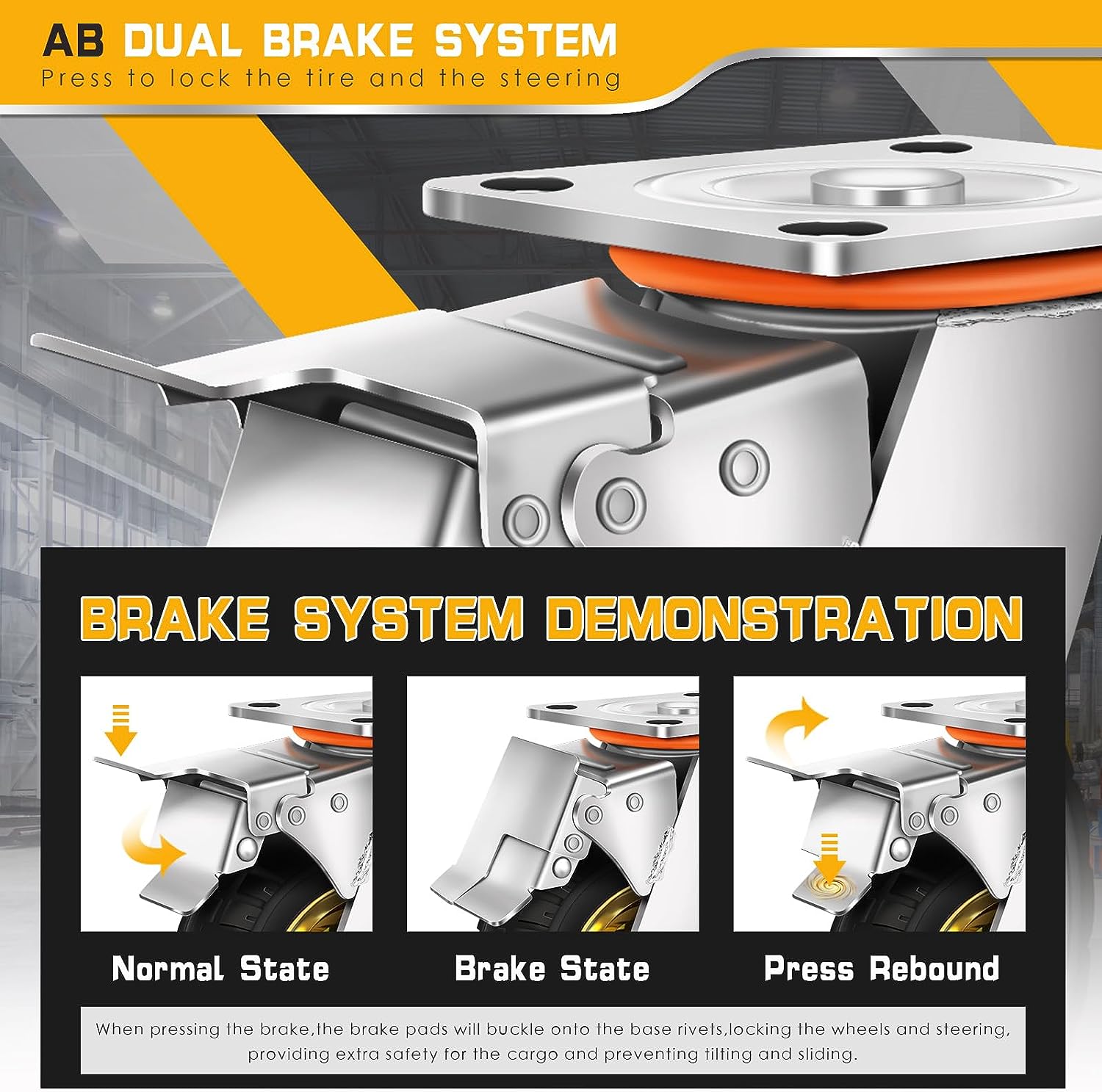 4 wheel flat carts have 2 rigid caster wheels and 2 swivel wheels with BRAKE DESIGN so that you can easily move the extra long push cart dolly in any direction you need and stop in anywhere; 6 inch diameter caster wheels made of solid rubber ensure maneuverability on pavement or gravel.