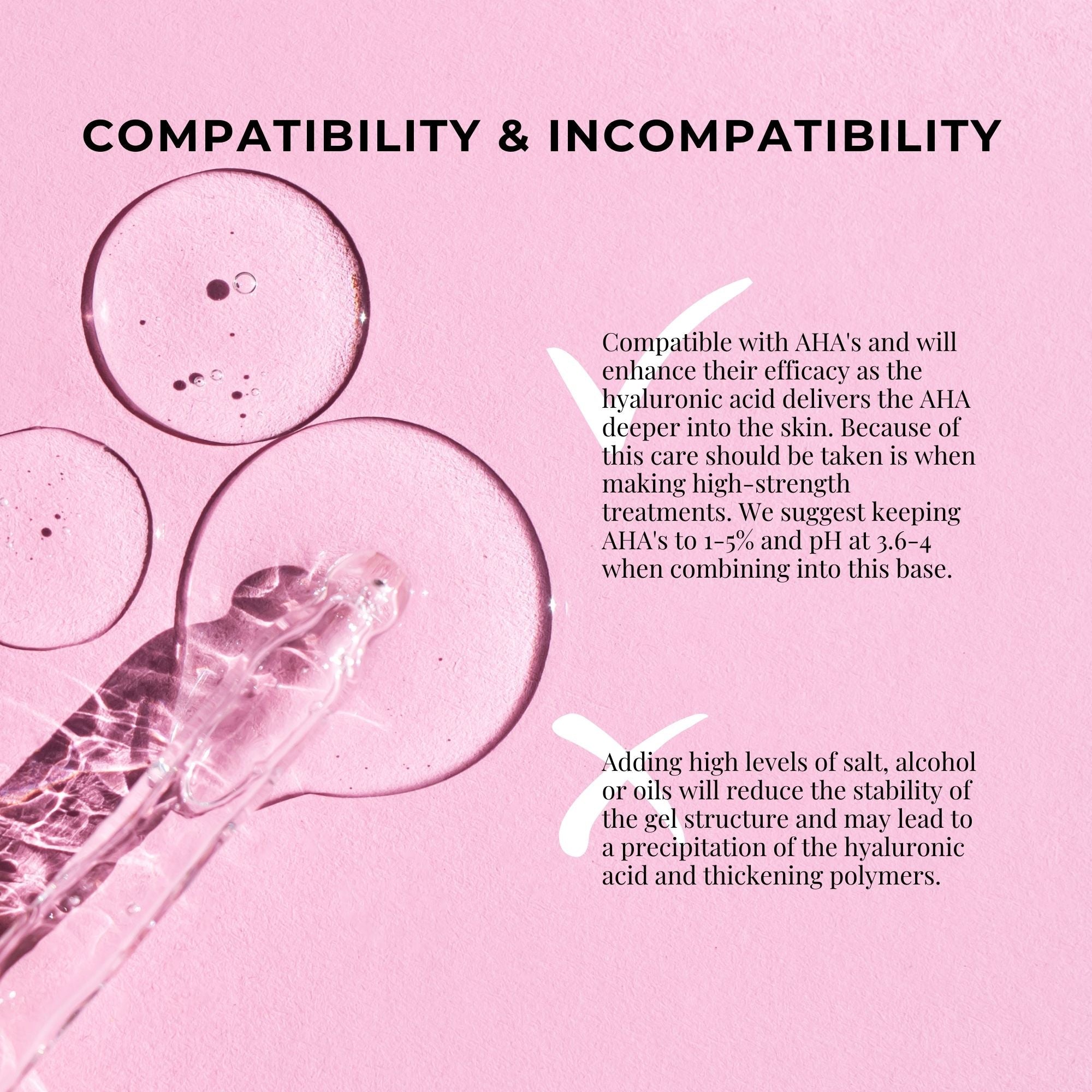- Compatible with AHA’s and will enhance their efficacy as the hyaluronic acid delivers the AHA deeper into the skin. Because of this care should be taken is when making high-strength treatments. We suggest keeping AHA’s to 1-5% and pH at 3.6-4 when combining into this base.