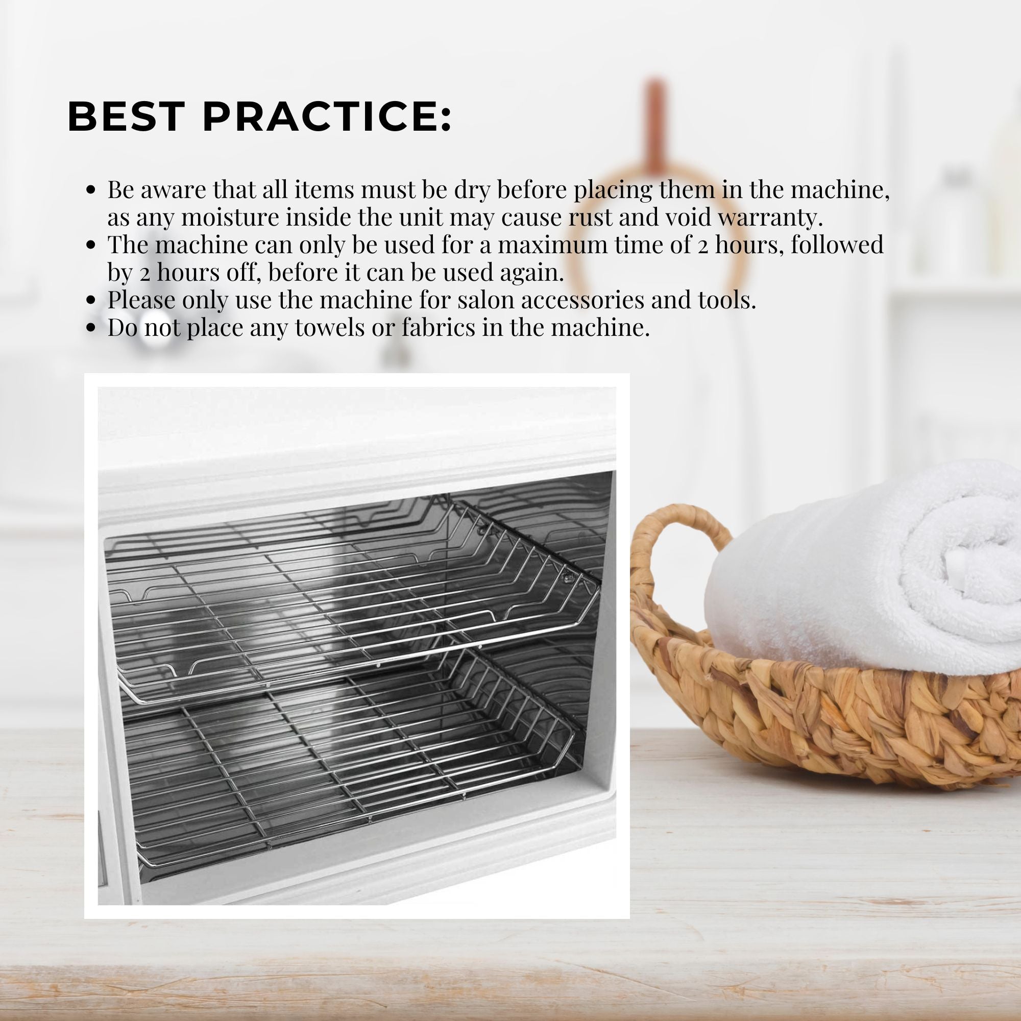Effectively sanitises and cleans hair salon and beauty equipment such as glass, pedicure and manicure tools and plastic using UV lighting technology.