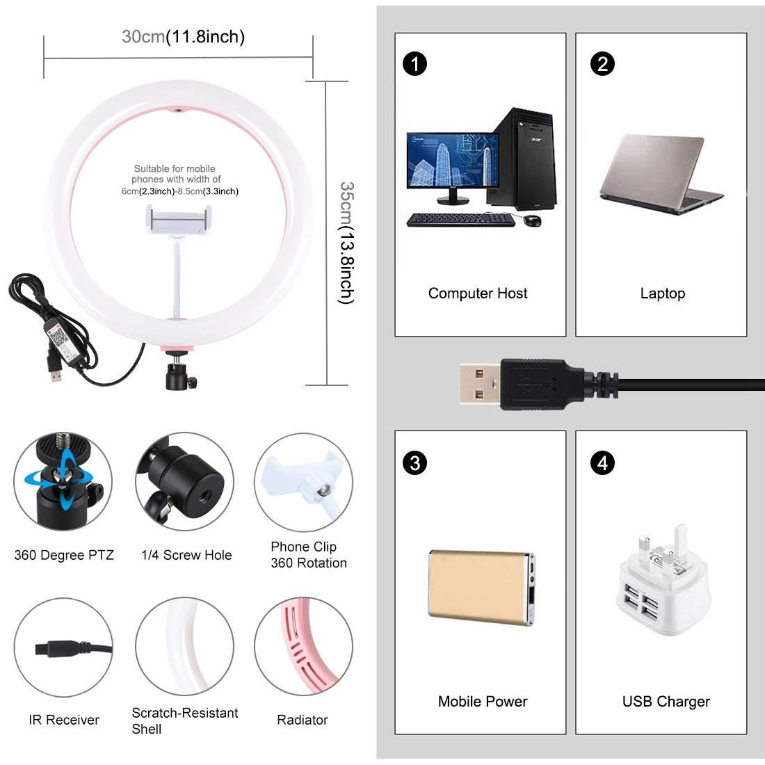 • LED ring light with 360 degree rotating tripod ball head for adjustable angles (holder not included)