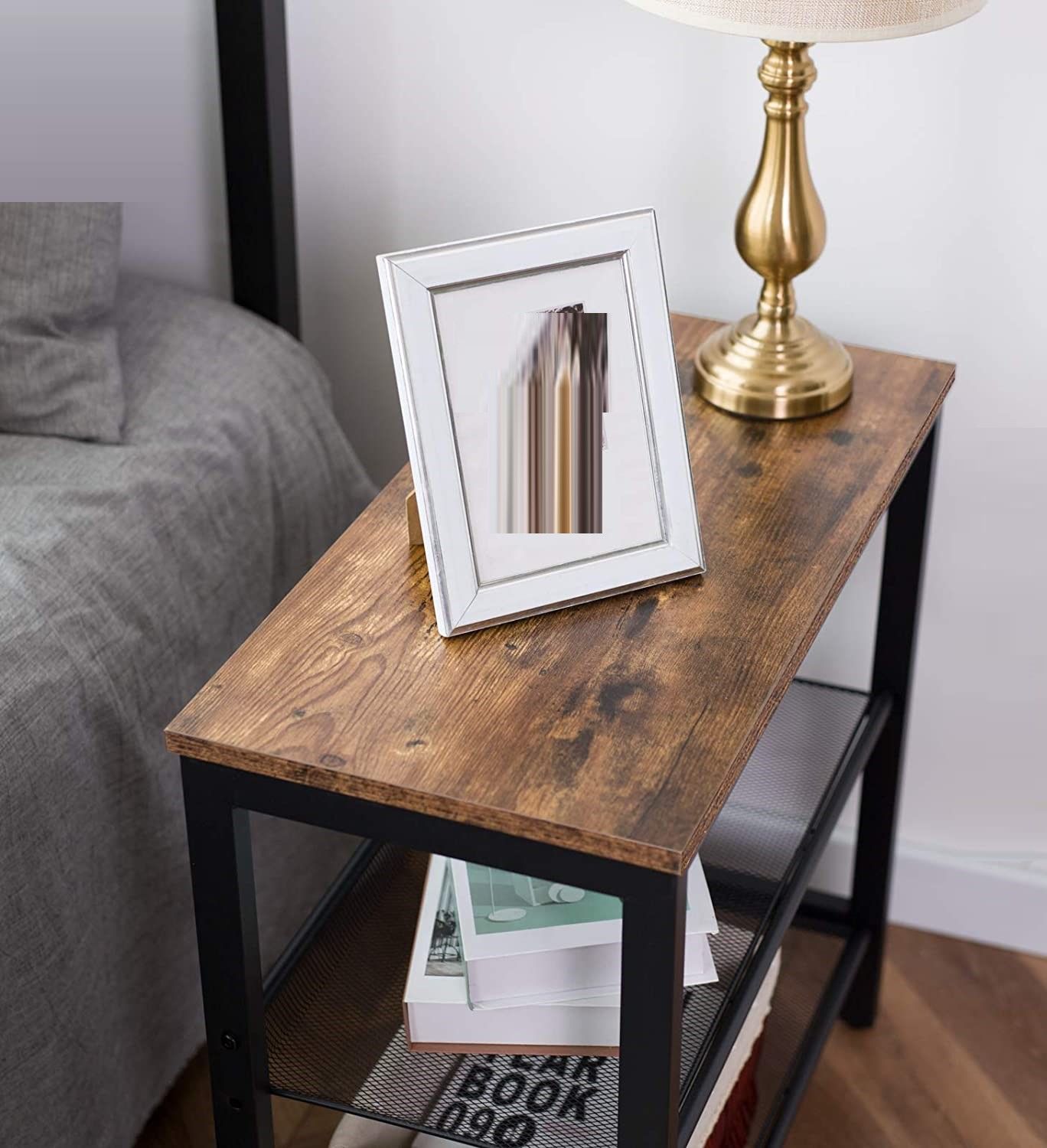- Looking Different: This narrow end table choose to use the classic combination of black and brown – the wooden board in rustic brown, and both the metal frame and the linenette fabric storage bag are in black, this is a great bedside table you will like.