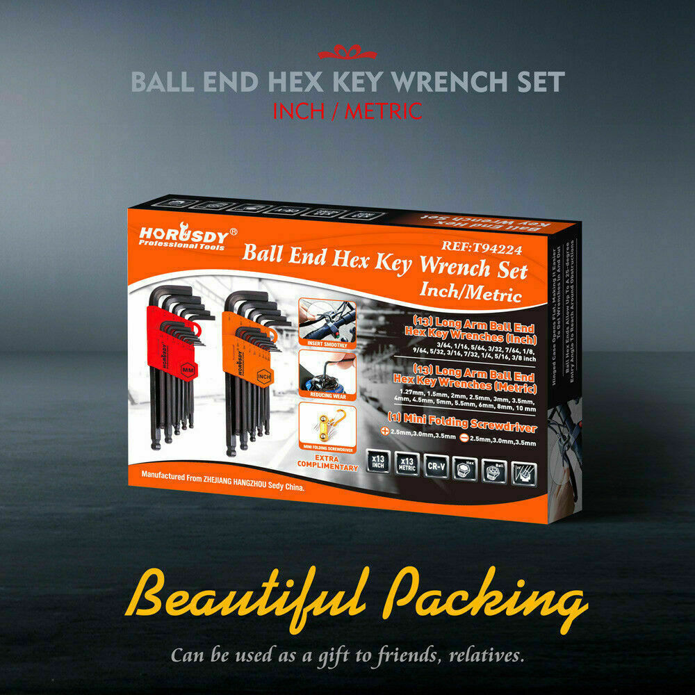 26Pc Allen Wrench Set Ball End Long Arm Hex Key Metric & Imperial With Holders