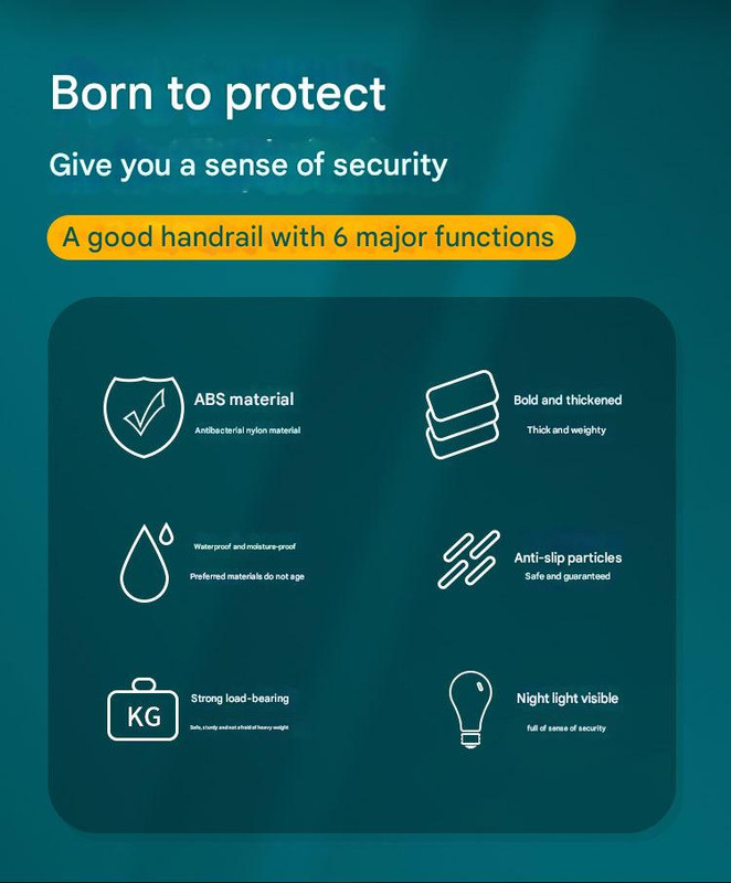 Enhance safety and stability in any environment with our Heavy-Duty Anti-Slip Safety Grab Bar. Expertly engineered with a dual-tube design, this grab bar combines a high-pressure resistant stainless steel inner core with a comfortable, antibacterial nylon outer layer. The surface features raised, non-slip particles to ensure a secure grip, even with wet hands. For added safety in the dark, it incorporates two luminous rings that absorb light during the day and glow at night for up to 72 hours, providing a clear guide in low-light conditions. With a strong load-bearing capacity of up to 300kg, this durable and easy-to-install grab bar is an essential safety addition for bathrooms, hallways, stairwells, and public facilities.