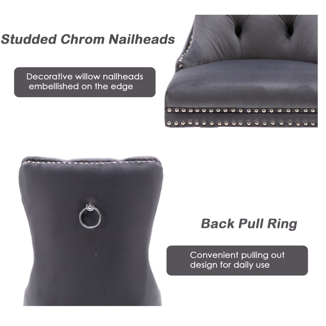 2x Velvet Dining Chairs Upholstered Tufted Kithcen Chair with Solid Wood Legs Stud Trim and Ring-Gray