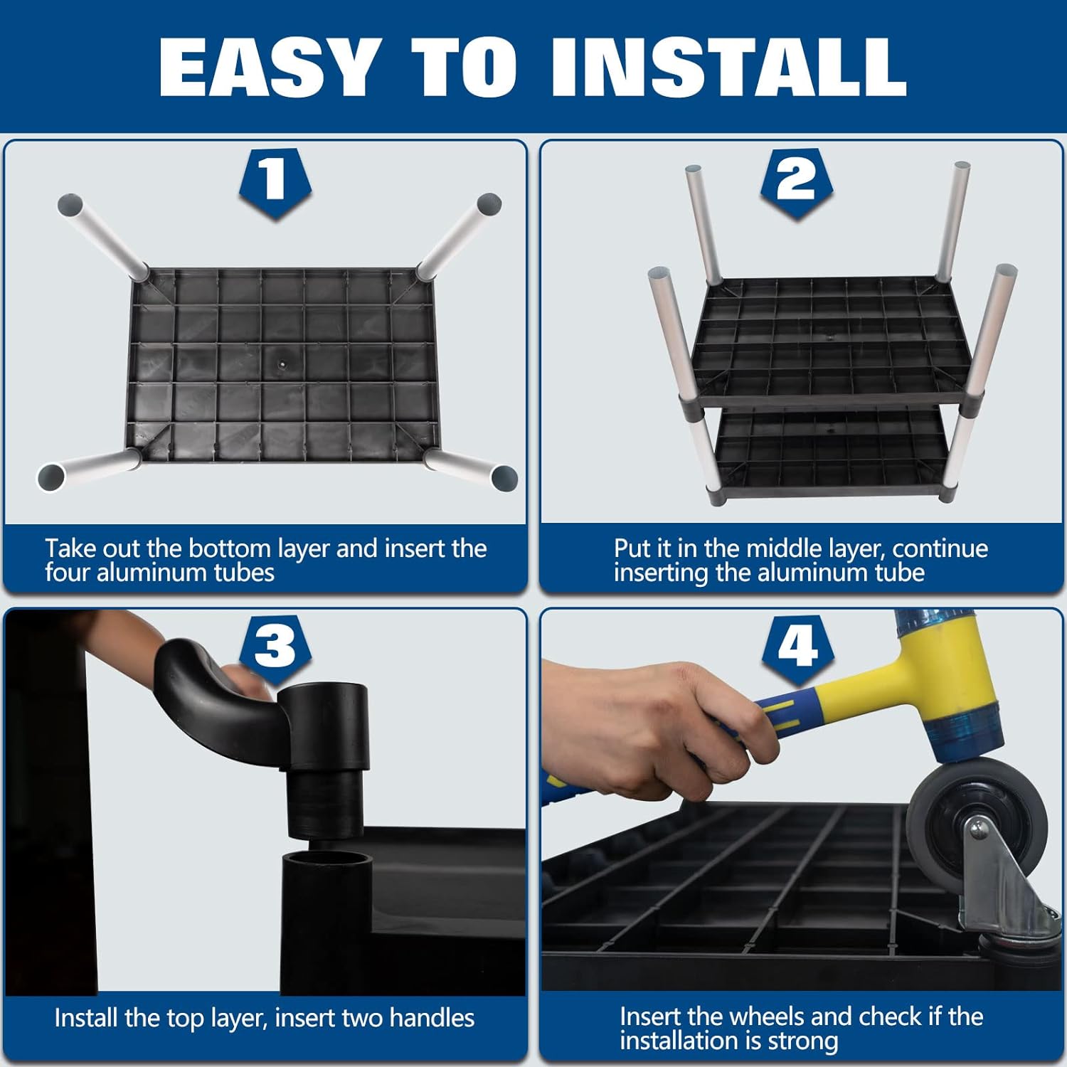 These durable and attractive carts work for front and back-of-house applications. Large shelves hold a variety of equipment and supplies. Smooth surfaces make the cart easy to clean. Molded shelves will not rust, dent or require painting. Brushed aluminum uprights are engineered for durability and appearance. Plastic construction minimizes noise. Large non-marking 4″ swivel casters reduce touch-up cleaning. Convenient handles located on each end and compact size enhances maneuverability. Carries up to a 240KG.