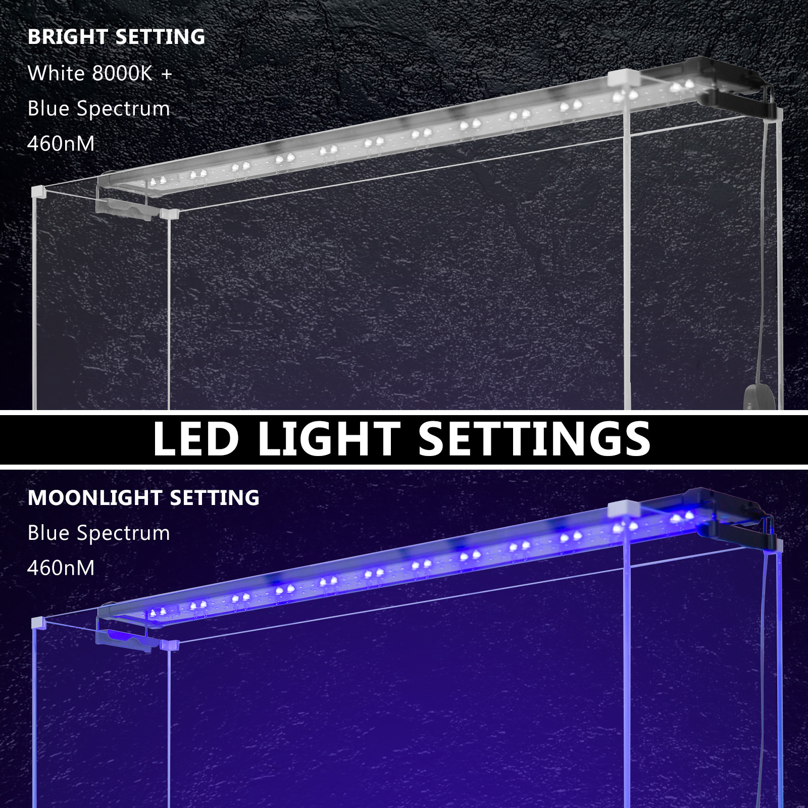 There is 2 setting on the aquarium LED. The first setting White and Blue all on. The White LED has a colour temperature of 8000K so its colour is as close as possible to the natural sunlight, which gives your fish tank an absolutely amazing and natural look. Together with the Blue LED has a colour Spectrum with 460nM, helps bring out the iridescence and blue/purple colours in your fish. The second setting is Just the Blue LED on: We called the Moonlight Setting. The blue lights not only mimic moonlight and, thus, encourage more physical activity, but these also provide them with illumination. You can also completely switch off the LED light, it’s best to turn off your aquarium lights at night to mimic plants and fish natural light cycle.