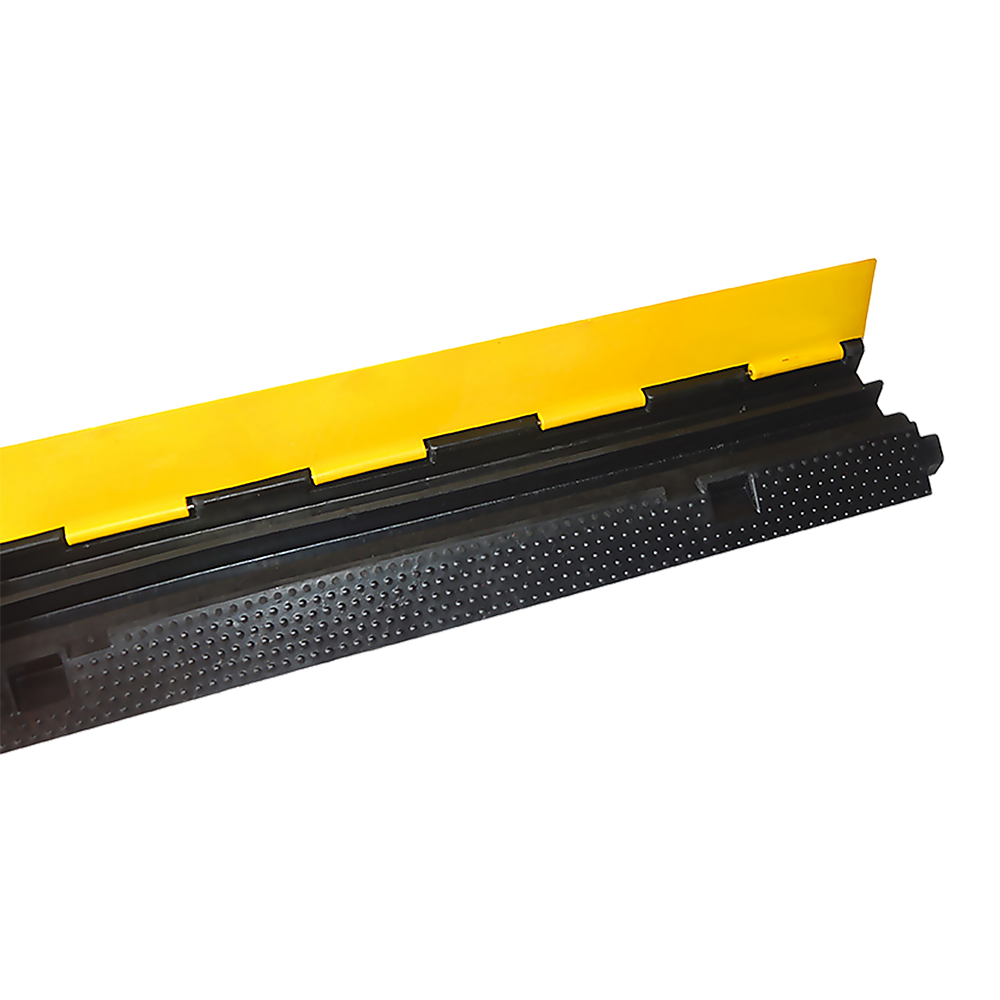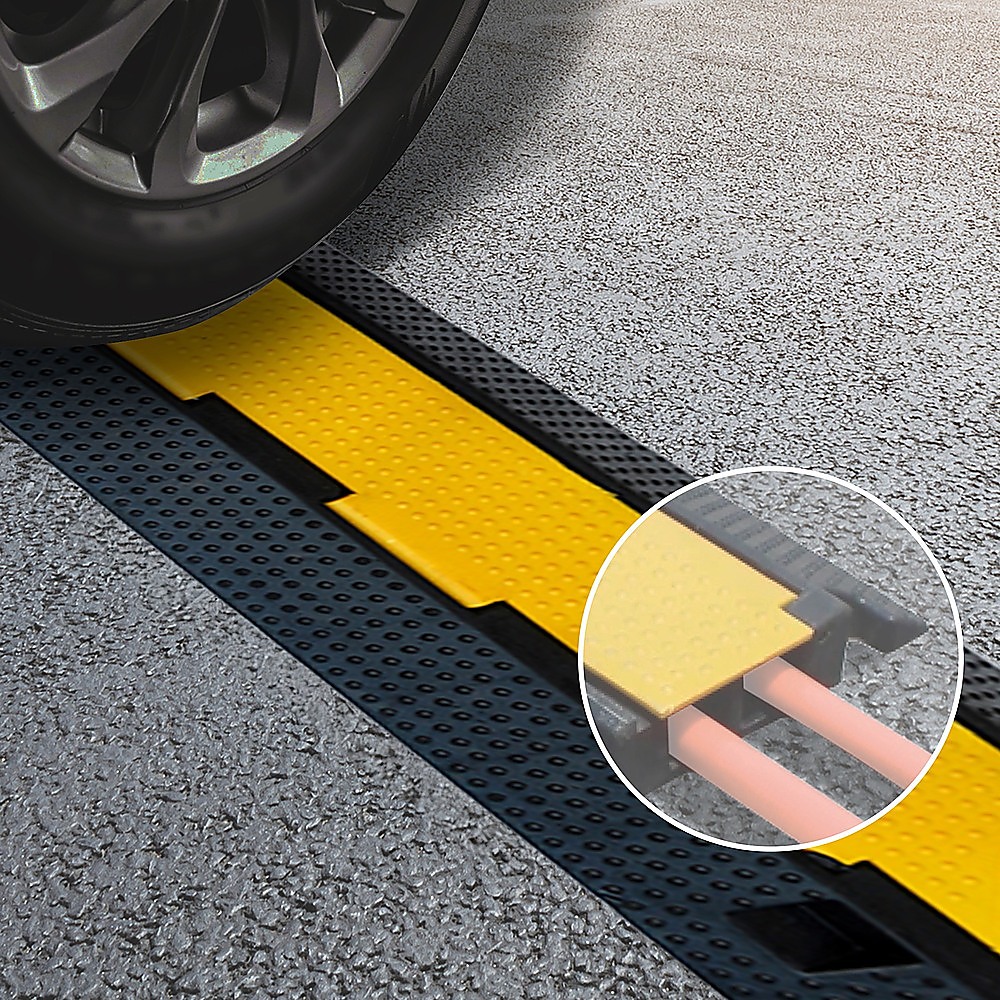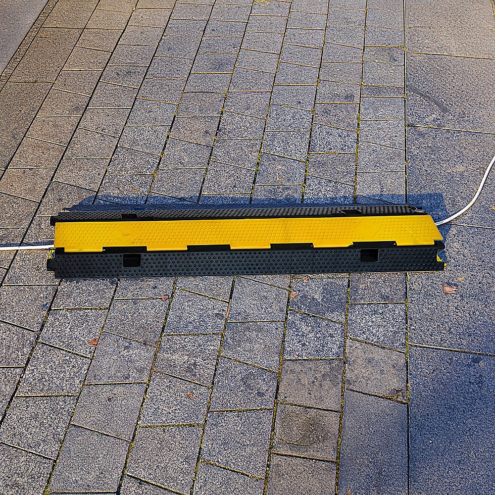 The dual channels are accessible through a PVC lid with written electrical safety warnings in writing and with international safety symbols. This system works equally well indoors and out to protect your cables and those who cross over them. Made from commercial-grade, heavy-duty thermoplastic rubber, these ramps have sloping sides to make it easy for carts and other wheeled vehicles to pass over.