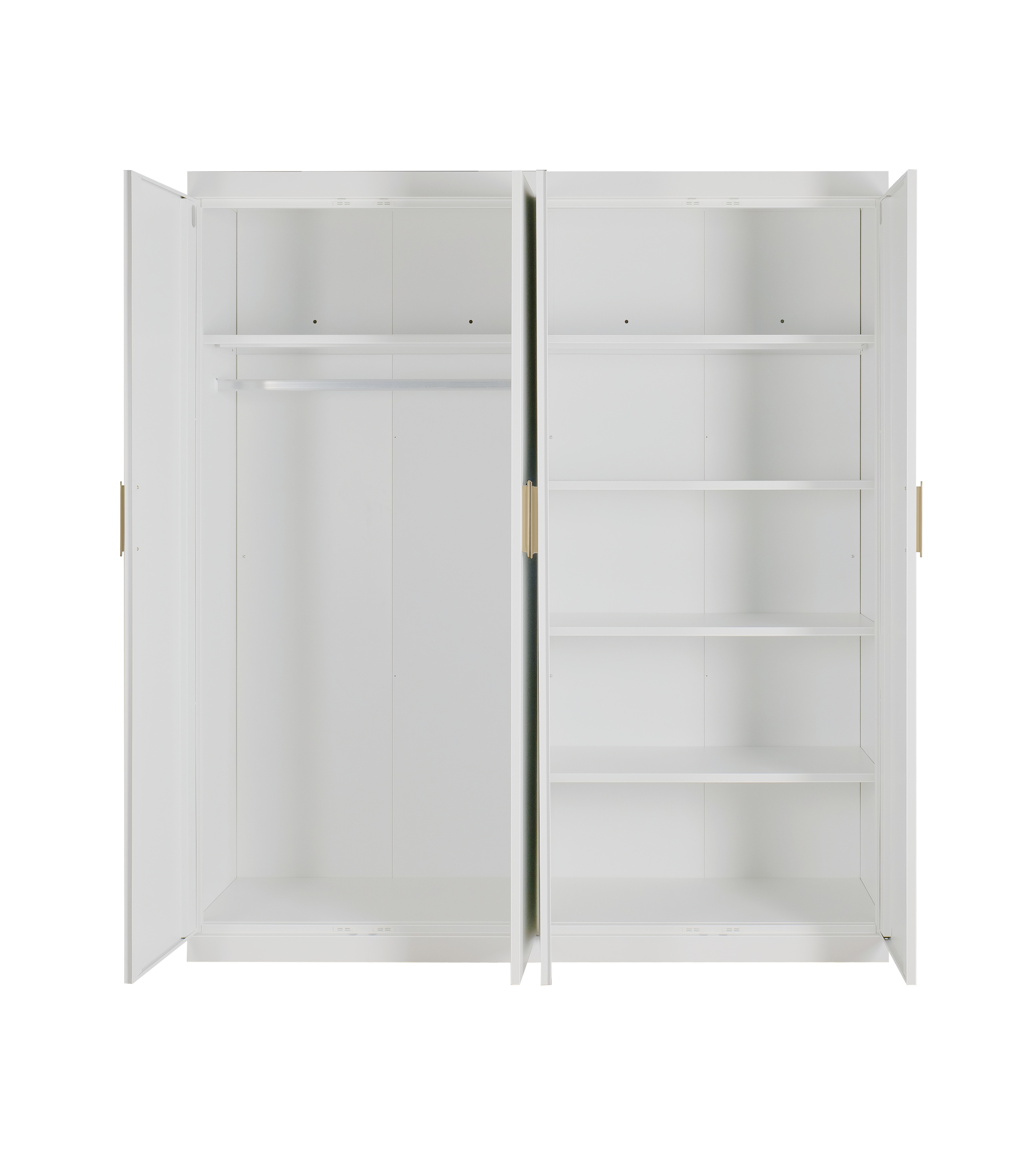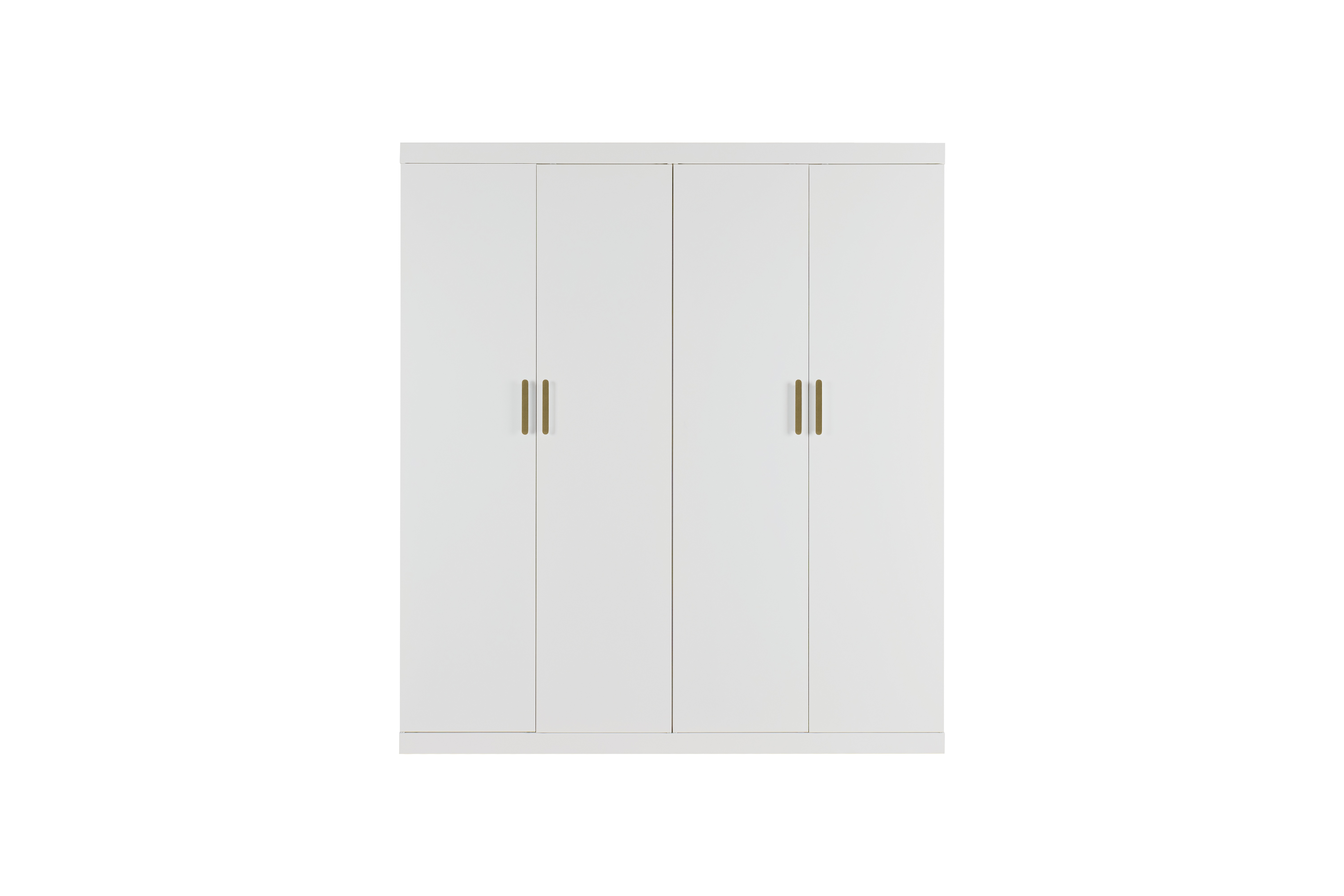 4 Door Wardrobe in White Gloss – Hanging Rail, Shelves & Gold Handles