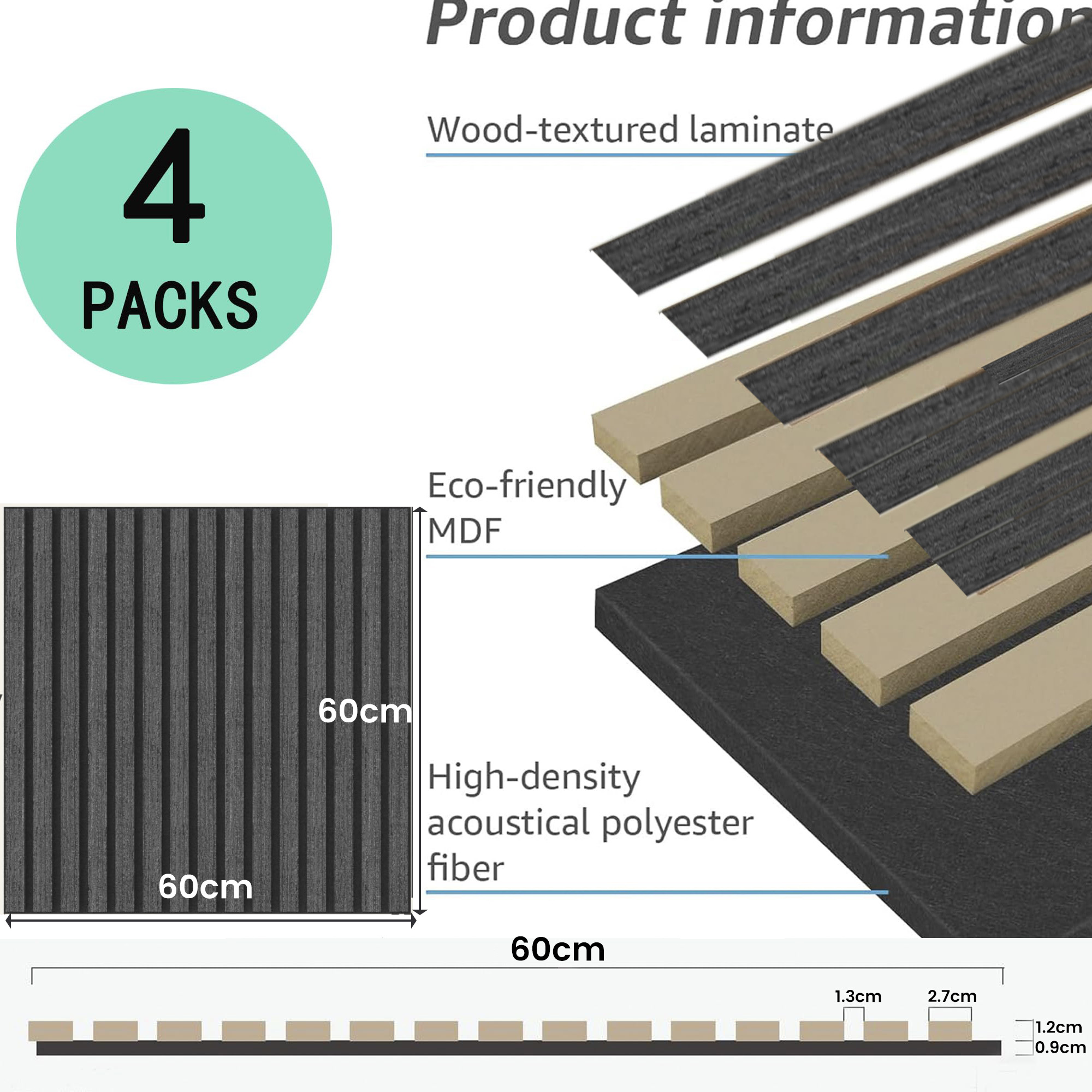 4 Pcs 60cm x 60cm Wall Panel Wood Slat Acoustic Panels Sound Absorbing Proof Panel for Wall Ceiling Decorative Black