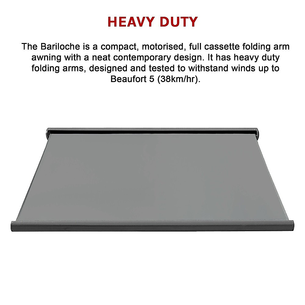 The Bariloche is a compact, motorised, full cassette folding arm awning with a neat contemporary design. It has heavy duty folding arms, designed and tested to withstand winds up to Beaufort 5 (38km/hr).