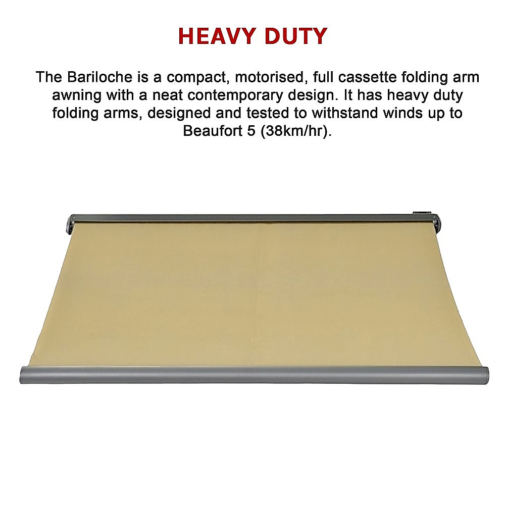 The Bariloche is a compact, motorised, full cassette folding arm awning with a neat contemporary design. It has heavy duty folding arms, designed and tested to withstand winds up to Beaufort 5 (38km/hr).