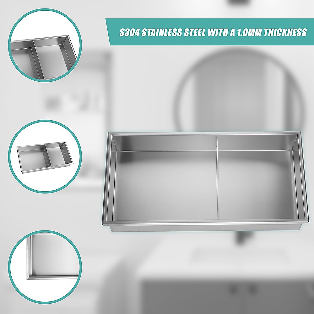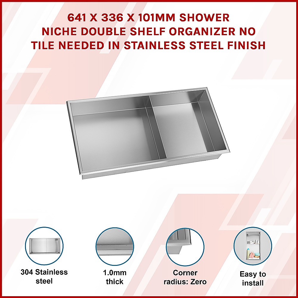 641 x 336 x 101mm Shower Niche Double Shelf Organizer No Tile Needed in Stainless Steel Finish