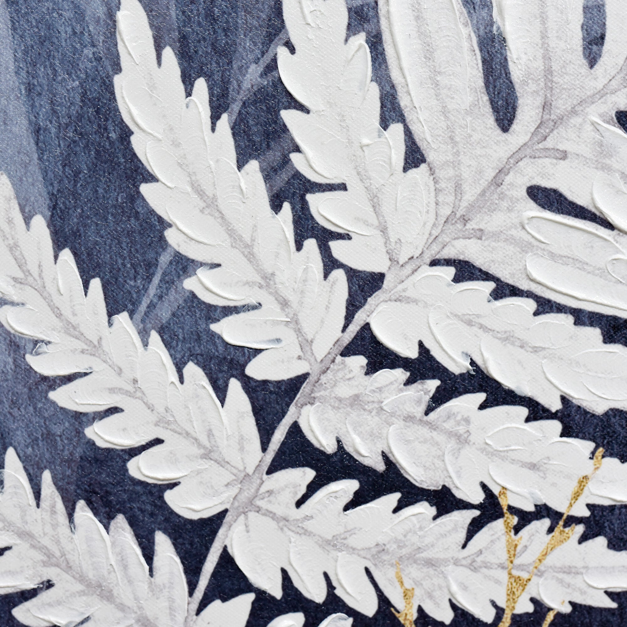 Dive into the ethereal beauty of nature with “Lustrous Foliage.” This 70cm x 100cm artwork offers a striking contrast between the shimmering gold and white upright foliages and the dreamy shades of blue that serve as their backdrop. As your gaze moves across the canvas, you’ll encounter a gradient of blue tones, transitioning from light to dark, evoking the tranquility of a twilight sky. The blue hues gently blot and meld into a pristine white background, adding depth and a sense of space to the composition. The delicate blend of hand-painting and print brings the foliages to life, making them stand tall and proud amidst the serene surroundings. Encased in a sophisticated dark wood frame, “Lustrous Foliage” is a testament to the harmonious interplay between color and form, capturing the essence of nature’s elegance.