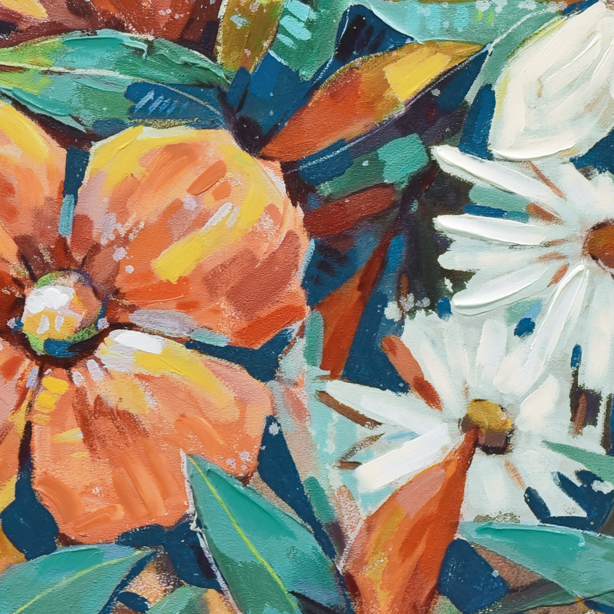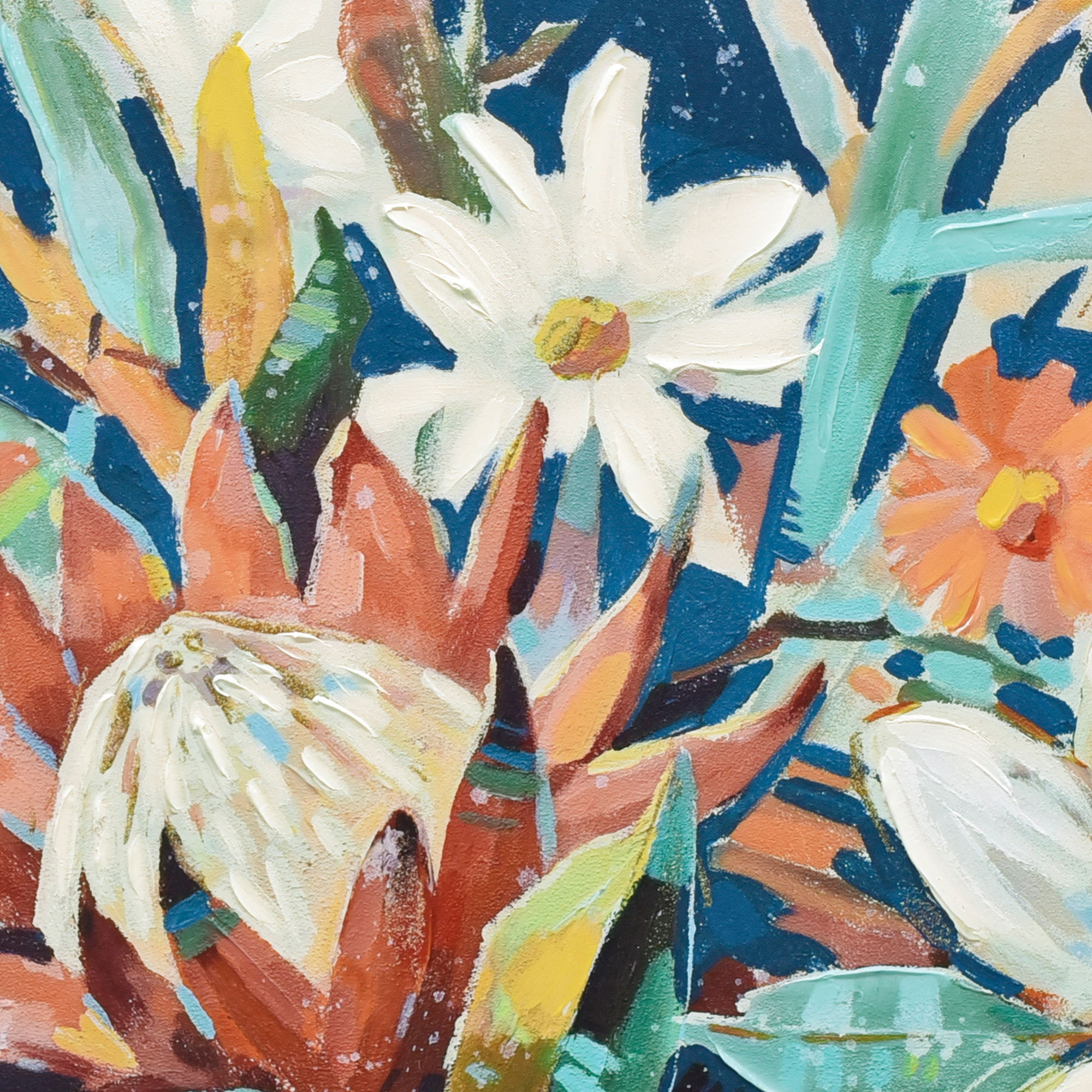 “Austral Flora” is a captivating blend of traditional artistry and modern techniques, presenting a fusion of 50% hand-painted elements intertwined with printed details. The canvas is dominated by the striking presence of a protea flower, nestled amid a bouquet of kangaroo paw and dogwood flowers. The choice of monotone orange and white for the blooms offers a stark yet harmonious contrast against the vibrant cyan leaves and deep blue backdrop. The composition is beautifully framed within dark fir wood, further enhancing the depth and richness of the palette. This artwork is not merely a depiction of flora but a celebration of the beauty and diversity of Australian botany, rendered in an abstract style that beckons viewers to appreciate the details and immerse in its allure.