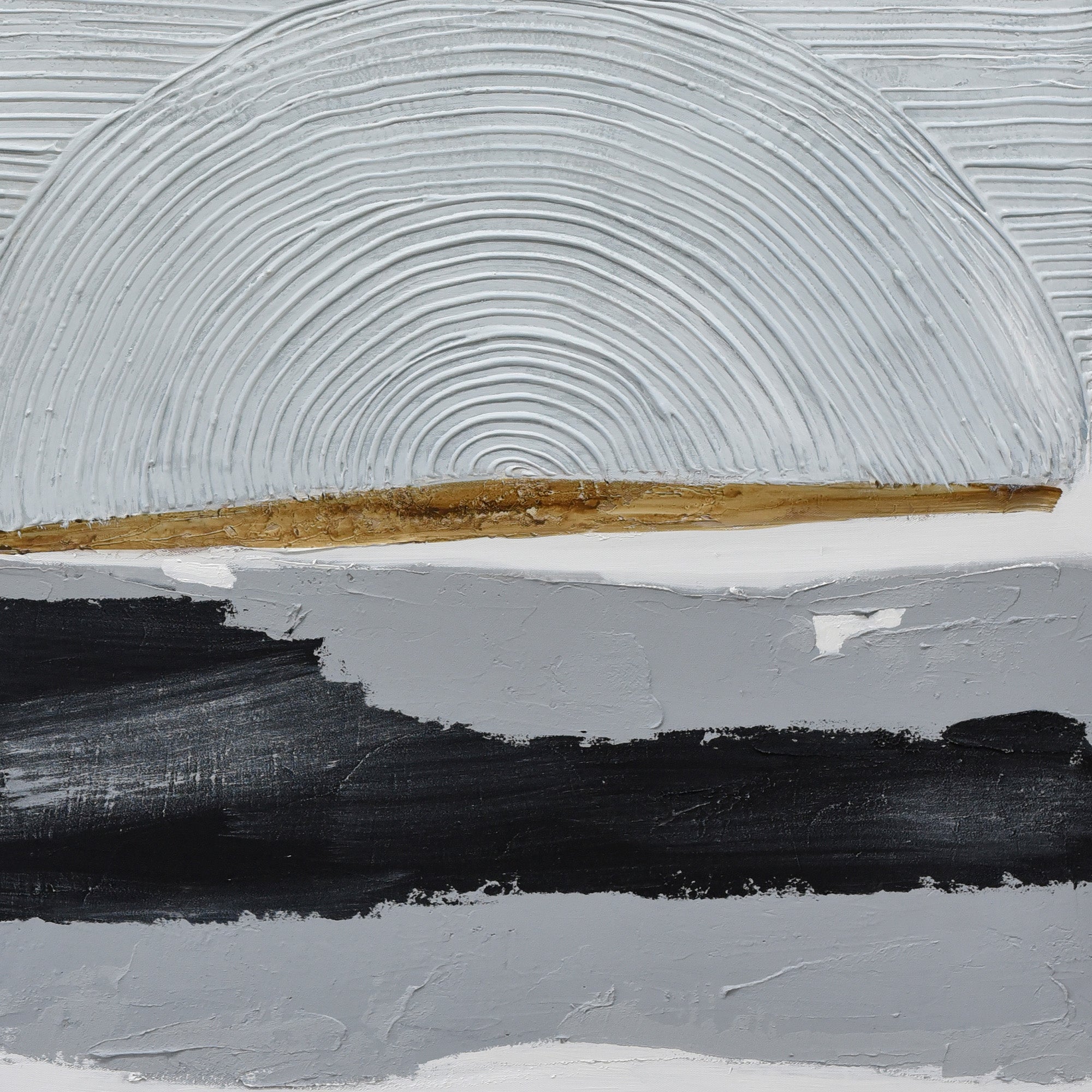 “Vibes of Vellichor” isn’t merely art—it’s an attitude. Its thick textures and playful contrasts set the stage for a visual dance, encapsulating the vibrancy and dynamism of modern life. Standing before it, one is compelled to groove to its rhythm, to muse, and to lose oneself in its funky narrative. Front and center, a prominent white dash pops against the canvas, acting as a contemporary guide through the labyrinth of hues. Whimsical baby blue grooves, both circular and linear, pirouette around this dash, channeling vibes of cool summer breezes and ocean waves. Moodier shades of grey and deep charcoal layer in, adding complexity and a hint of urban chic. The piece is masterfully unified by a dashing line of gold, a gleaming streak that screams modern luxury.