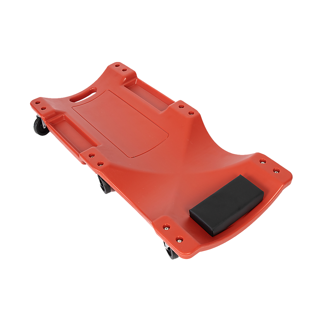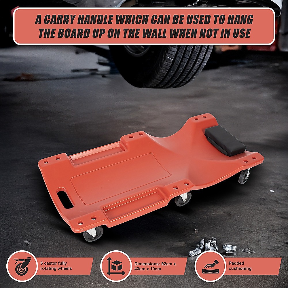 Measuring 92cm x 43cm x 10cm, the board is light enough to carry across your garage or workshop but sturdy enough to offer optimal support when laying on it. It has 6 castor wheels beneath the board which can be rolled in any direction. They provide smooth transitions and are built to last. The headrest has padded cushioning to keep you comfortable during longer stints under the car. There are 2 generous storage trays incorporated into the design as well – there is a tray on each side, which is handy if you need a lot of tools with you.