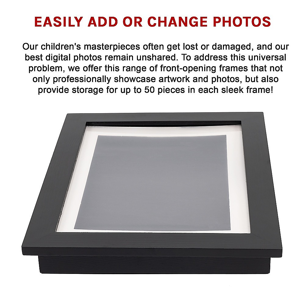 As proud parents, we all face the same dilemma: a collection of artwork and cherished photographs that we want to display. Often, we end up using our fridge as an impromptu art gallery and our computers as digital photo albums. Sadly, we rarely get to truly appreciate these treasures. Our children's masterpieces often get lost or damaged, and our best digital photos remain unshared.To address this universal problem, we offer this range of front-opening frames that not only professionally showcase artwork and photos, but also provide storage for up to 50 pieces in each sleek frame!