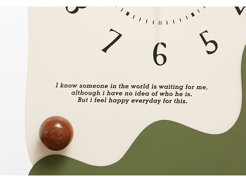 Add a touch of modern artistry to your space with this unique Abstract Wall Clock. Featuring a creative, irregular wavy design, this clock is more than just a time-telling device; it’s a piece of decorative art. The clock face is adorned with a thoughtful quote, adding a touch of inspiration to your day. A smooth, colored ceramic ball provides a delicate and warm accent, enhancing the clock’s overall aesthetic. Its silent, non-ticking movement ensures a peaceful environment, making it perfect for living rooms, bedrooms, offices, or any space that could use a stylish and tranquil touch. With its simple two-step installation, you can easily elevate your decor.