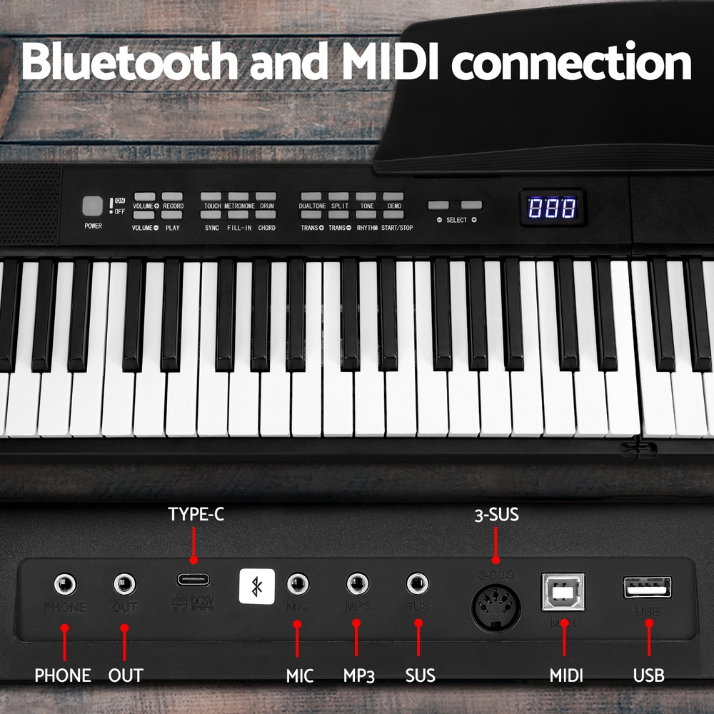 Do you love music? Do you want to spend your day playing and singing your favourite songs? Let the Alpha Electric Keyboard help to realize your musical aspirations. With 88 touch-sensitive keys, the Alpha Keyboard enables you to discover a whole new world of music. Some of these exceptional built-in features include: 128 rhythms, 128 timbres, 80 demo songs, various effects controls, Bluetooth connection, and much more. With a MIDI-USB function, you can plug and play to other devices or computers. With various inputs for microphone and headphones as well as speaker outputs, the Alpha Keyboard allows you to record and playback your music for all to hear. Best of all, the keyboard has a convenient folding design so you can store it away with ease. Your package also includes a microphone and a sustain pedal. Cultivate your love of music with an Electric Keyboard from Alpha.