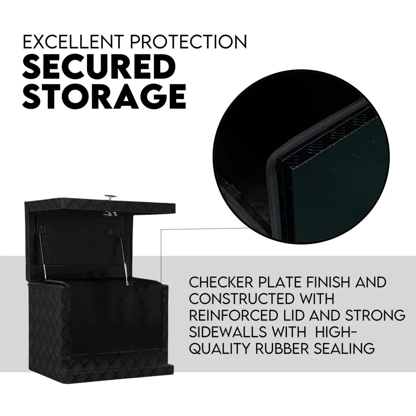This tool box has a checker plate finish and constructed with reinforced lid and strong sidewalls. The high-quality rubber sealing and fully welded seams also helps to keep your precious equipment and tools clean and dry from the weather elements. Better still, the open-top design enables you to access your tools and supplies with minimum hassle.