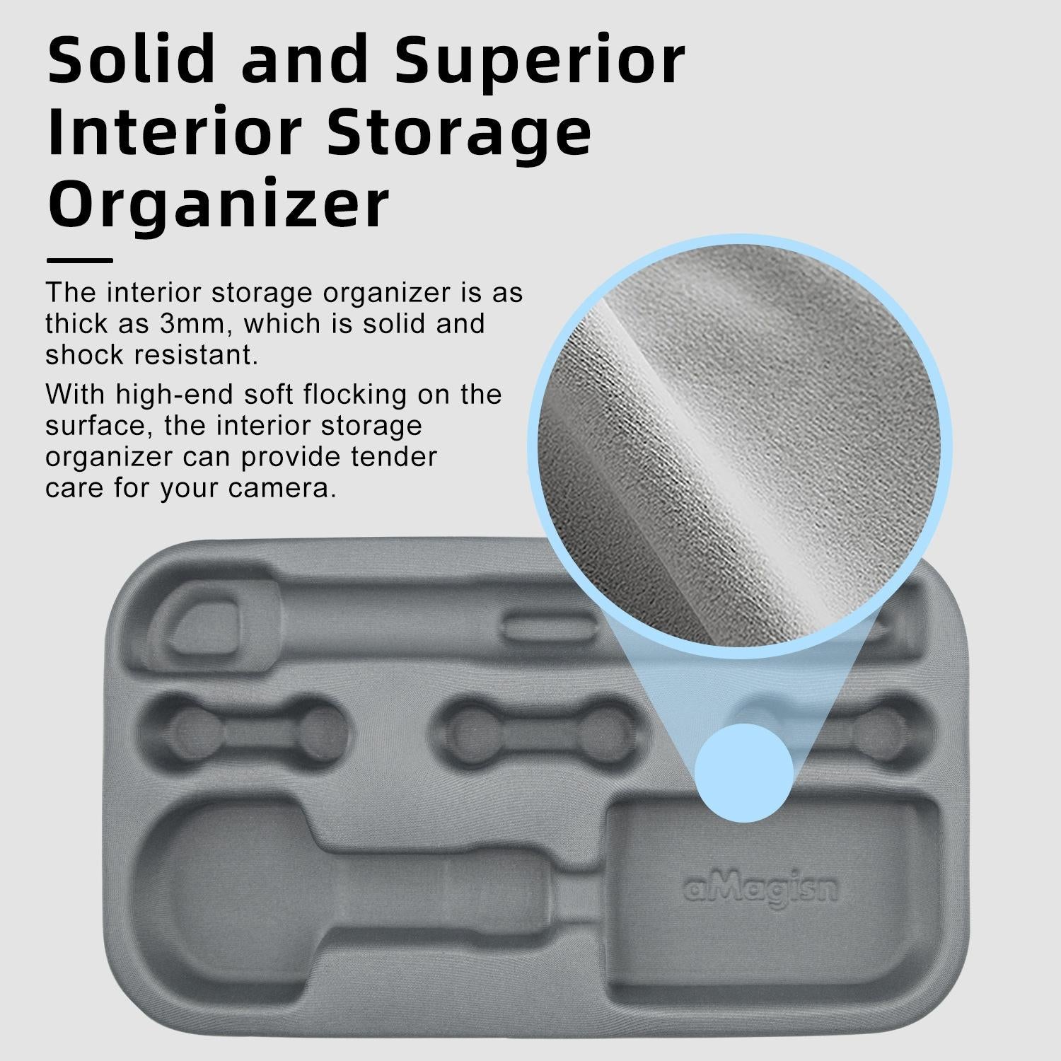 • The thermoformed inner support has moderately tight slots to keep items in place. It is shockproof and anti-fall, and the flexible surface fabric protects your camera.
