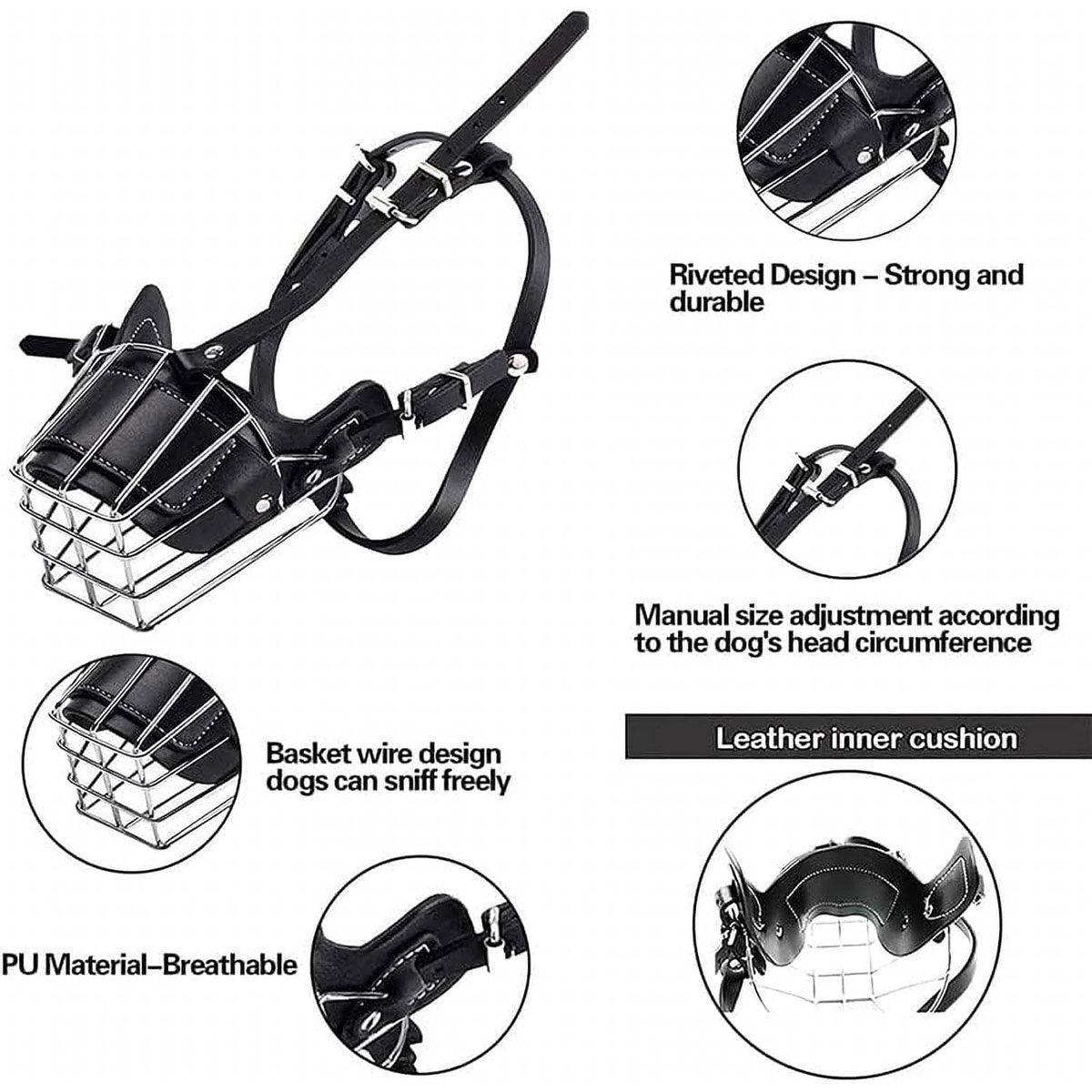 This durable dog muzzle features a sturdy stainless steel frame and a comfortable PU leather lining, providing effective protection for your pet. It helps prevent biting, barking, and eating harmful objects, making it ideal for training, vet visits, and outdoor walks. The adjustable straps ensure a secure and comfortable fit for different dog breeds. With its breathable design, your dog can pant and drink water freely while staying safe. Made from high-quality materials, this muzzle is rust-resistant and built for long-term use.