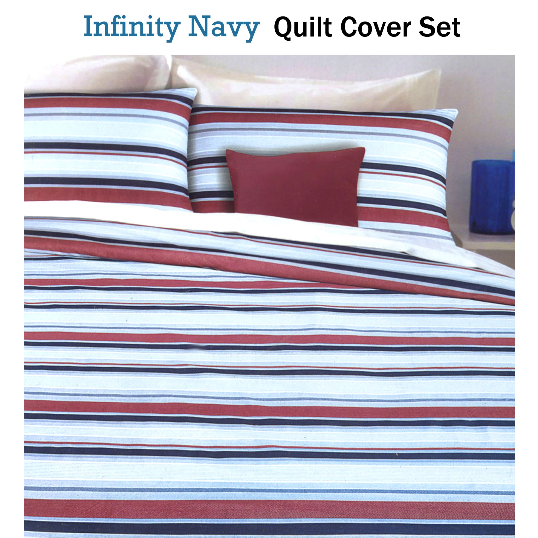 Add a pop pattern into your bedroom with this Infinity Navy Polyester Cotton Quilt Cover Set by Apartmento. It features a colourful stripes print design in White, Blue, Navy, and Red colour tones that will create a focal point in your bedroom. It is made from quality and soft touch Polyester Cotton blend fabric with easy care properties.