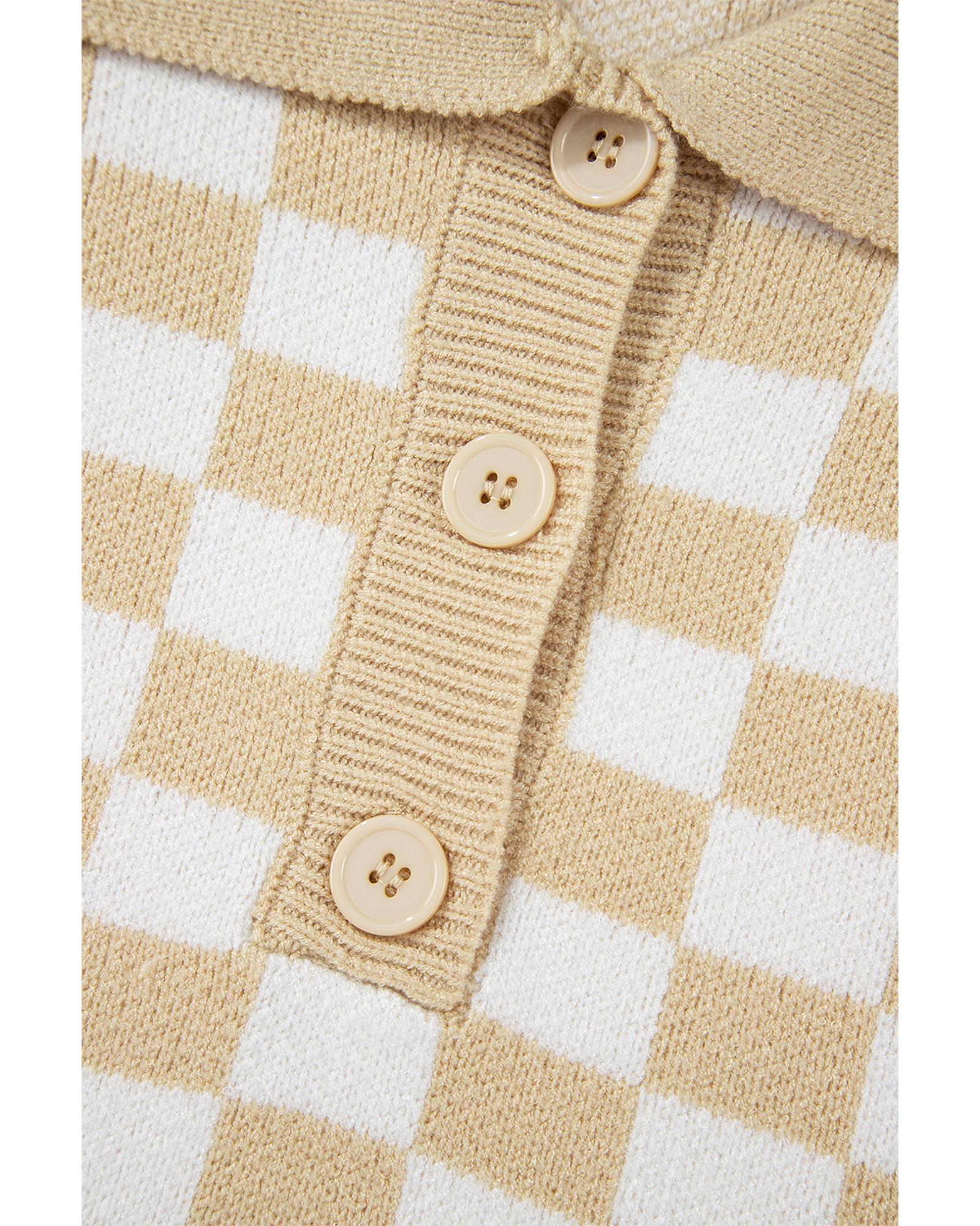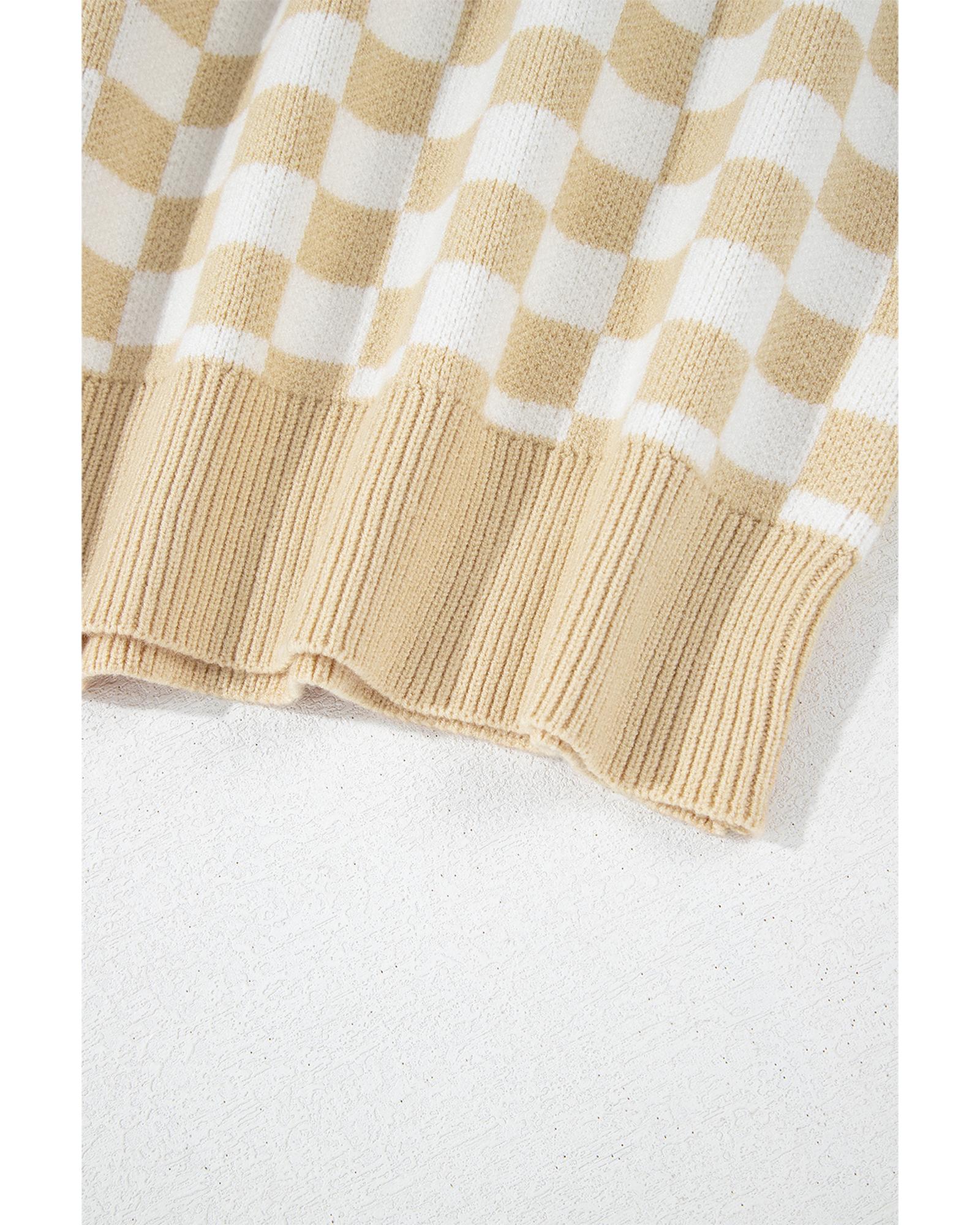 Apricot Checkered Buttons Collar V Neck Drop Shoulder Sweater – M