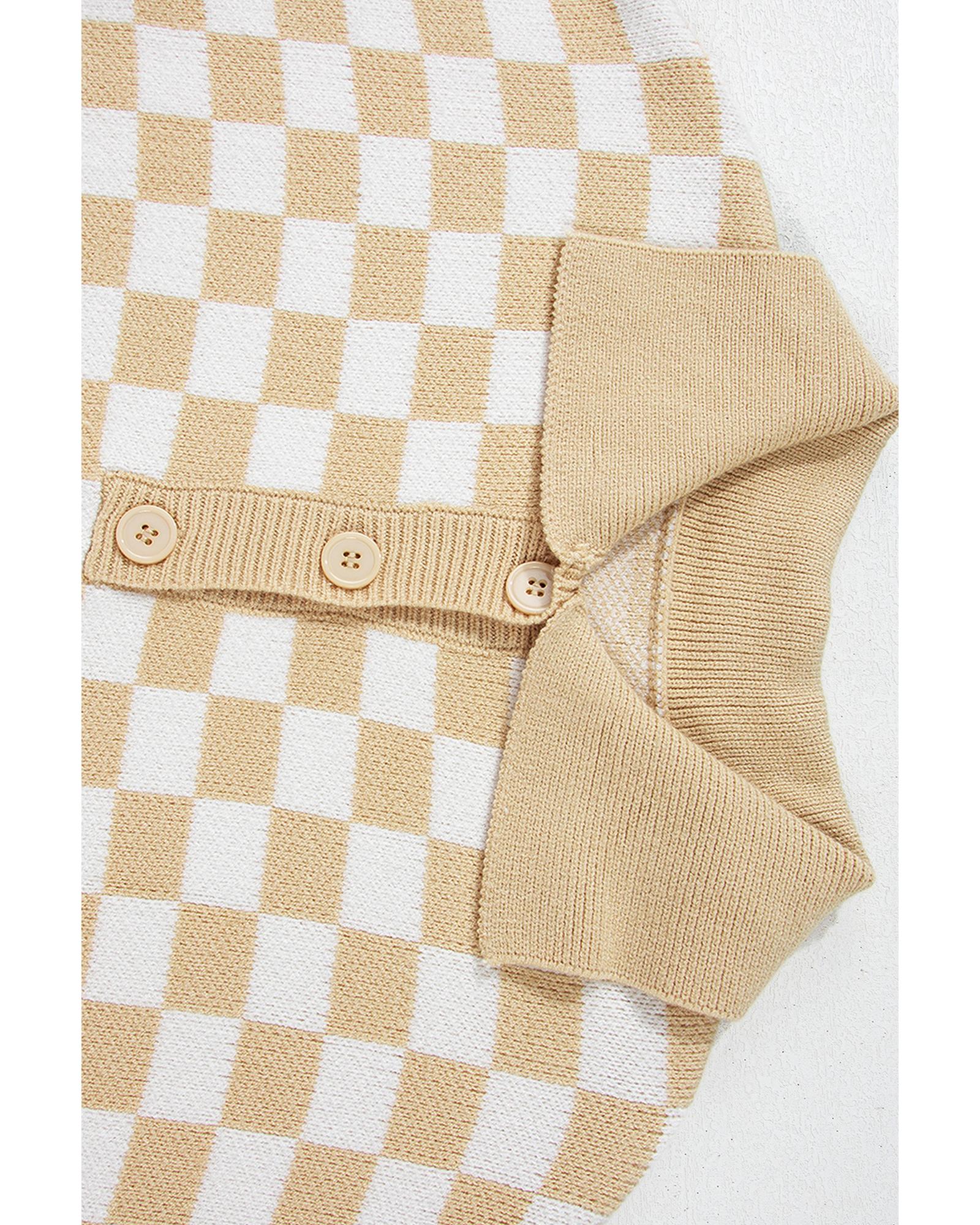 Apricot Checkered Buttons Collar V Neck Drop Shoulder Sweater – XL