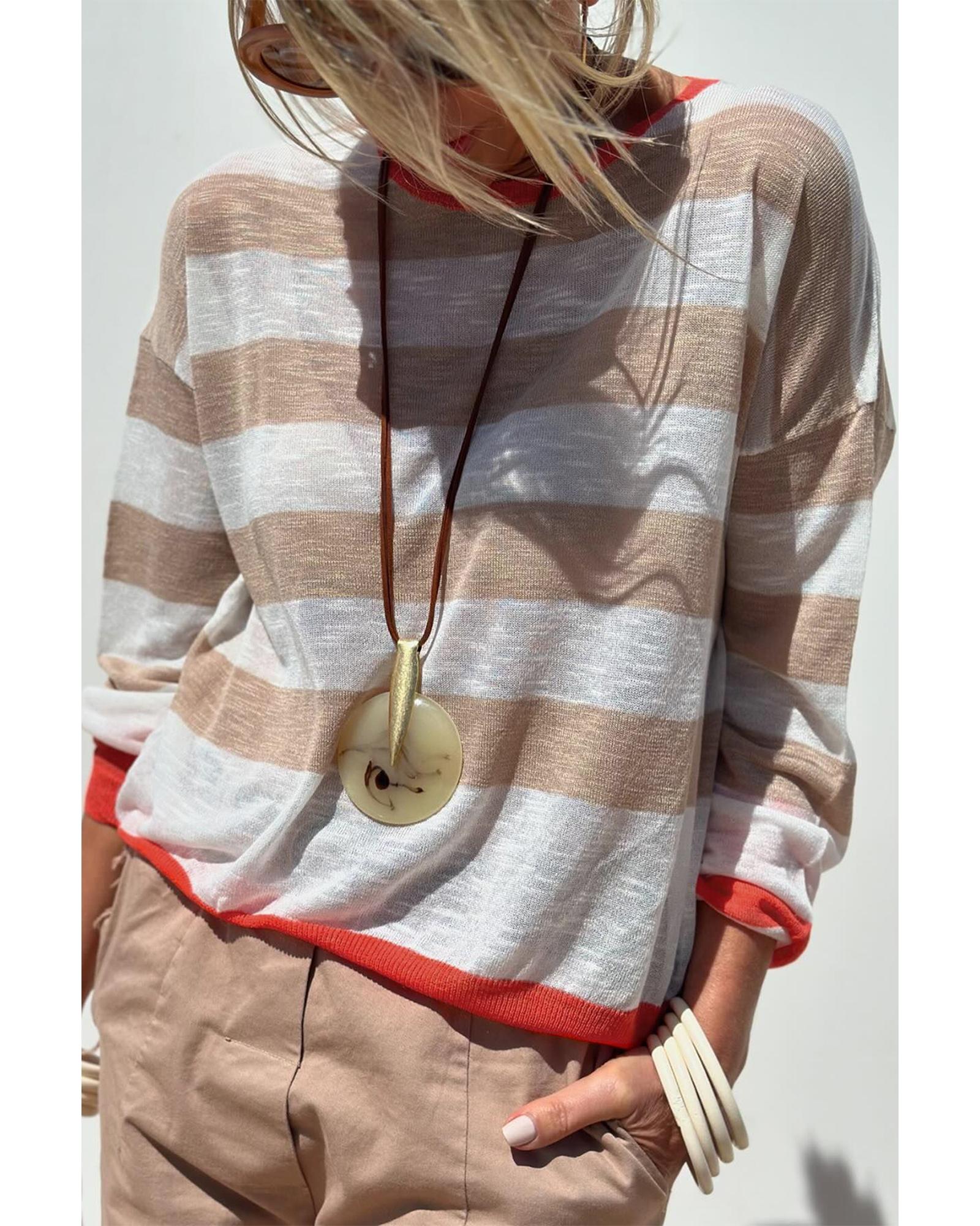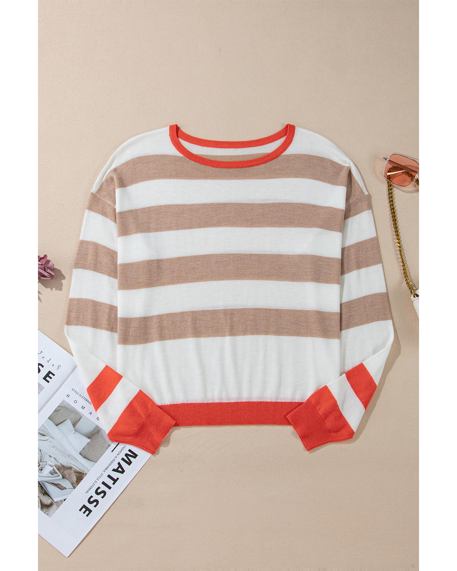 Apricot Colorblock Striped Round Neck Drop Shoulder Sweater – XL