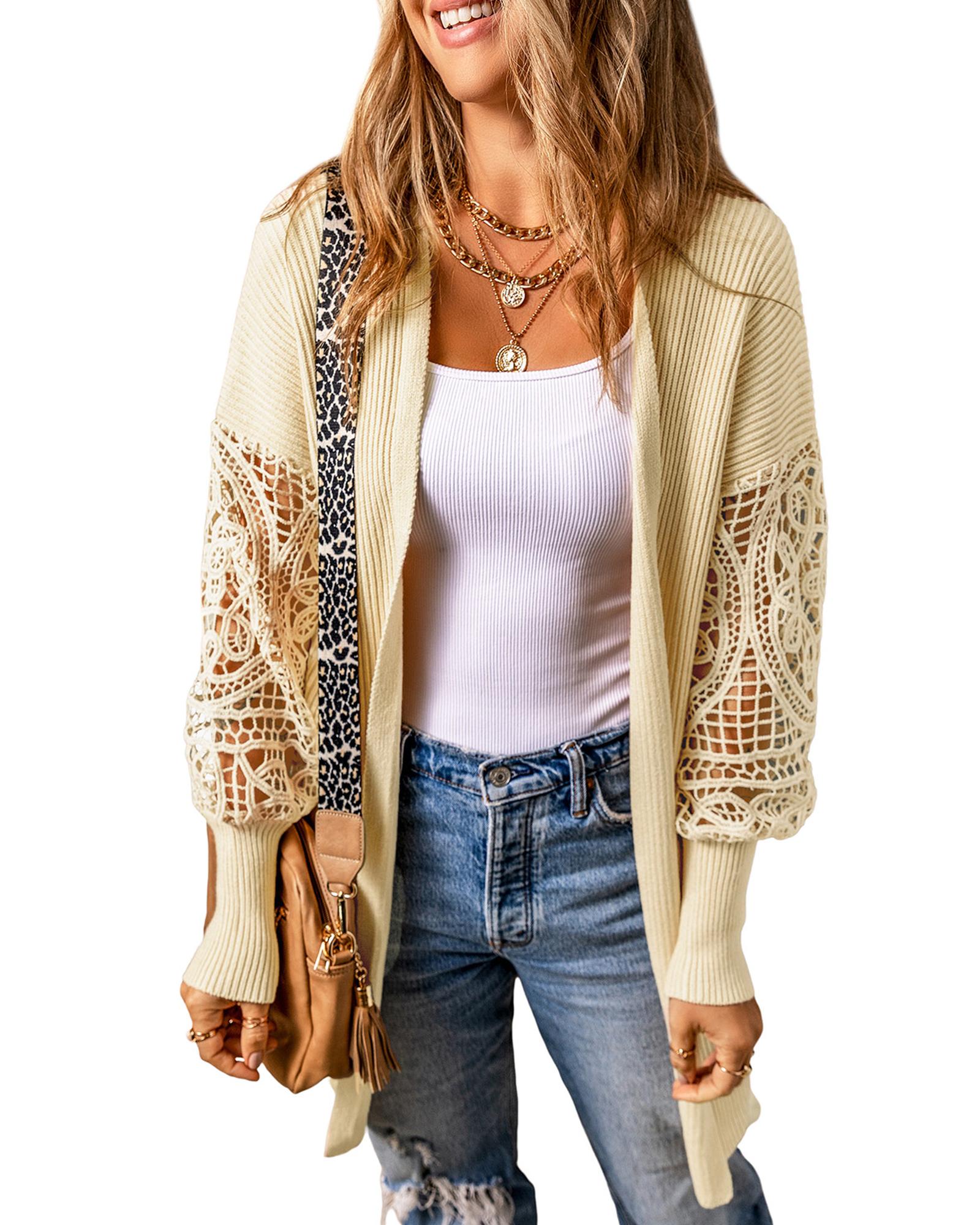 Apricot Crochet Lace Sleeve Ribbed Knit Cardigan – S