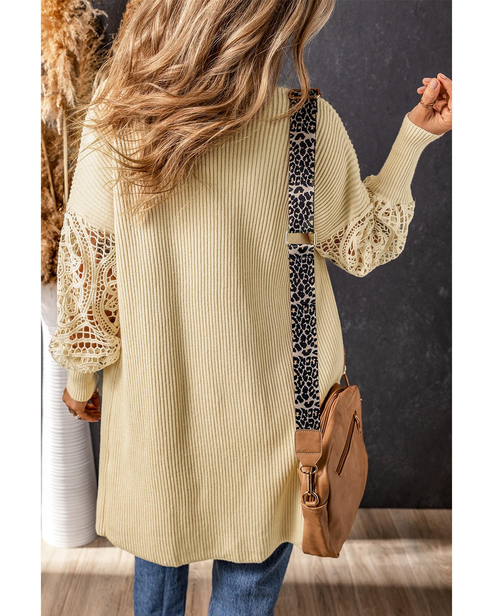 Apricot Crochet Lace Sleeve Ribbed Knit Cardigan – XL