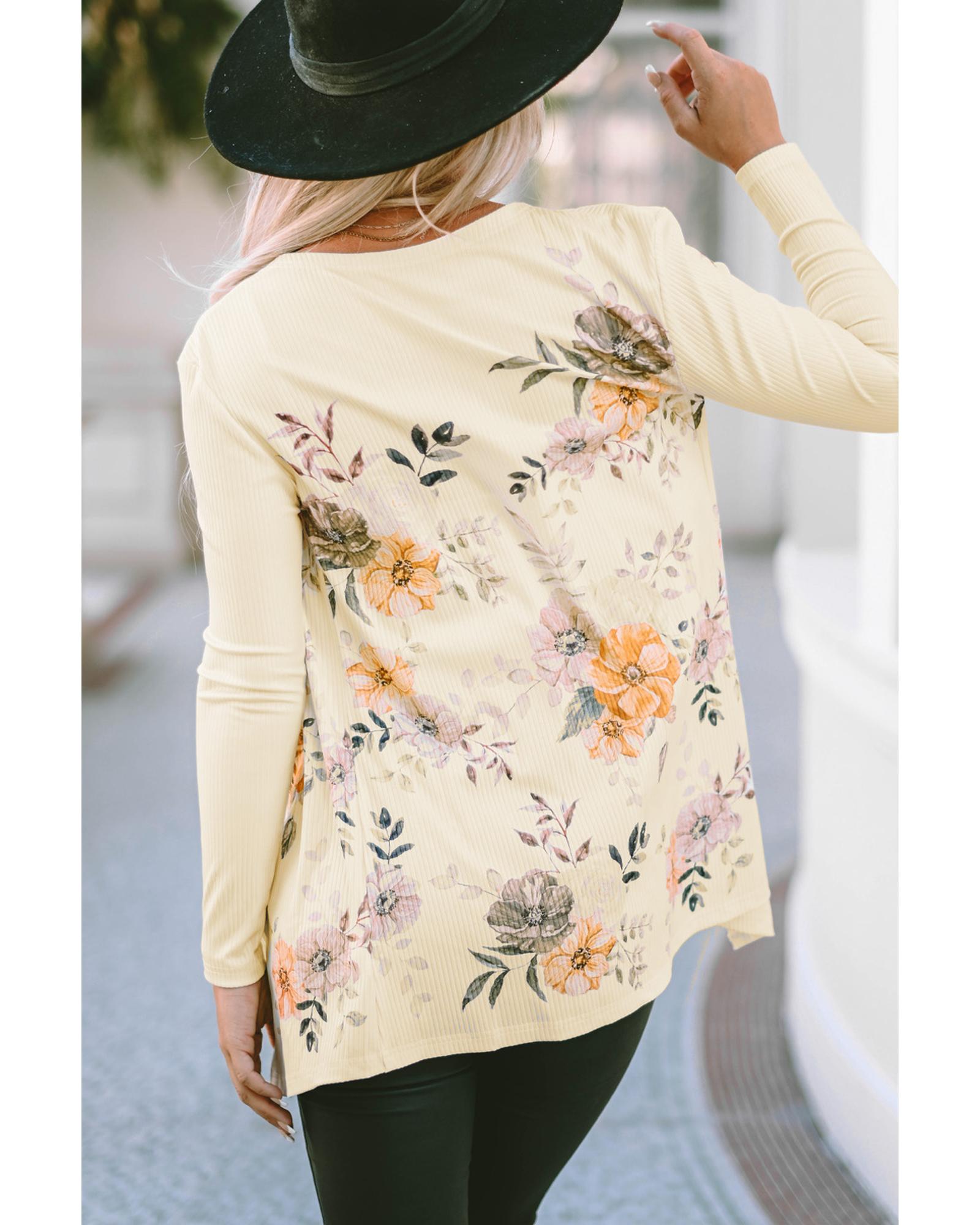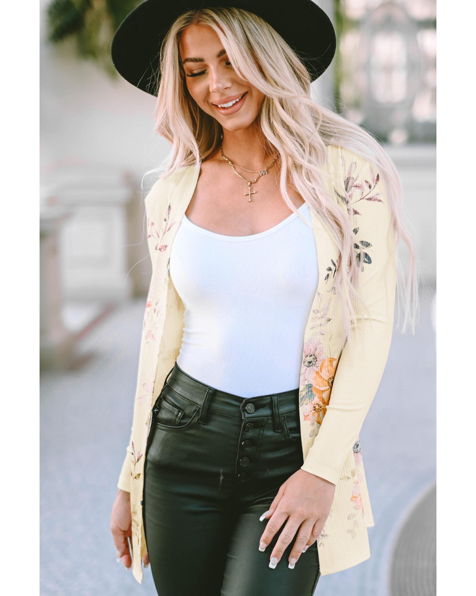 Apricot Floral Print Ribbed Knit Slim Fit Cardigan – L