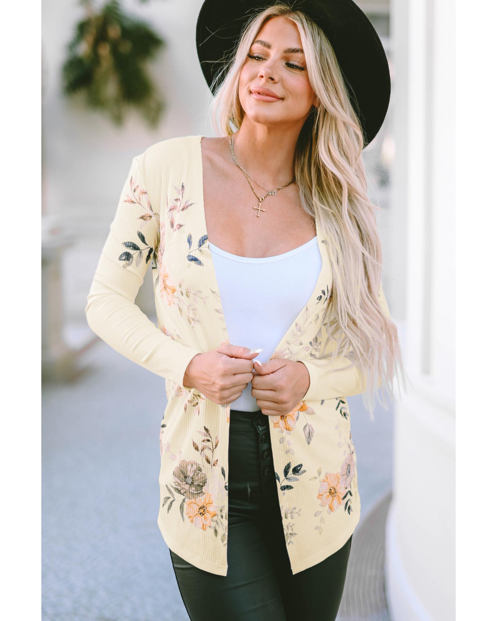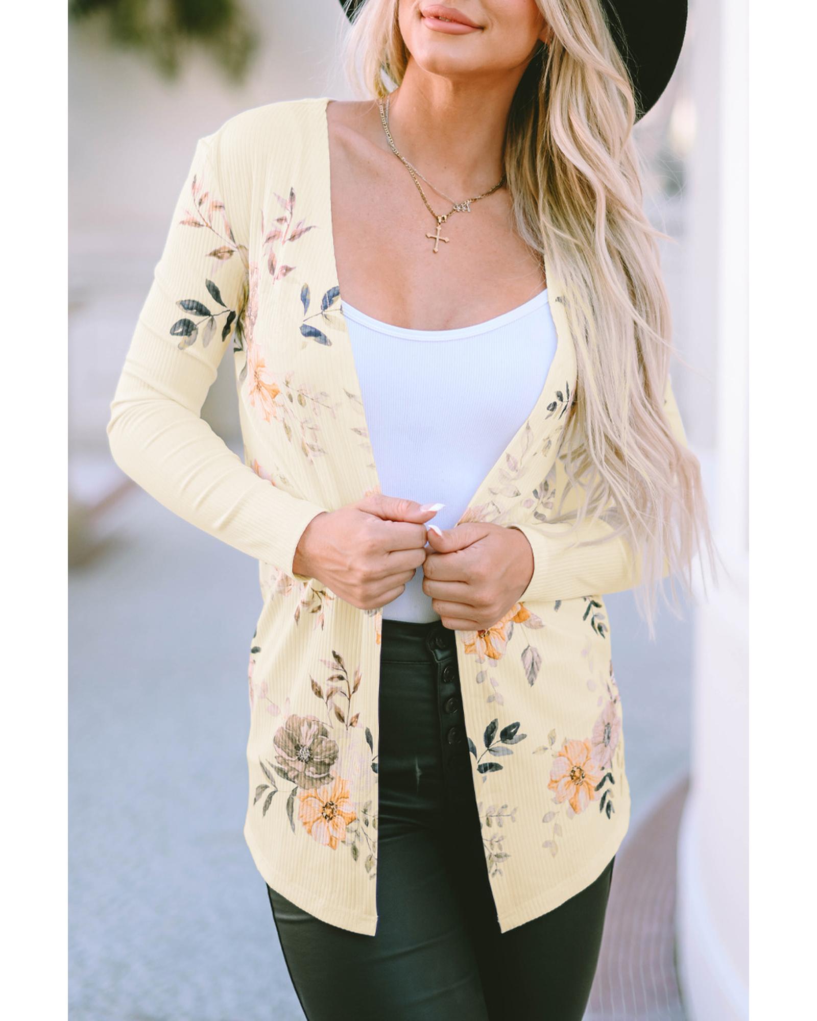 Apricot Floral Print Ribbed Knit Slim Fit Cardigan – S