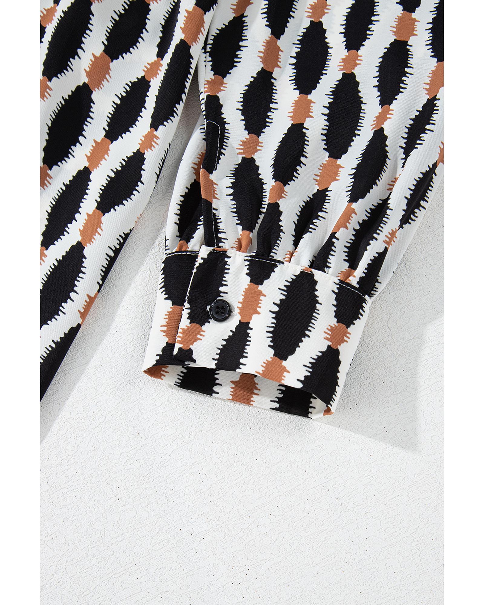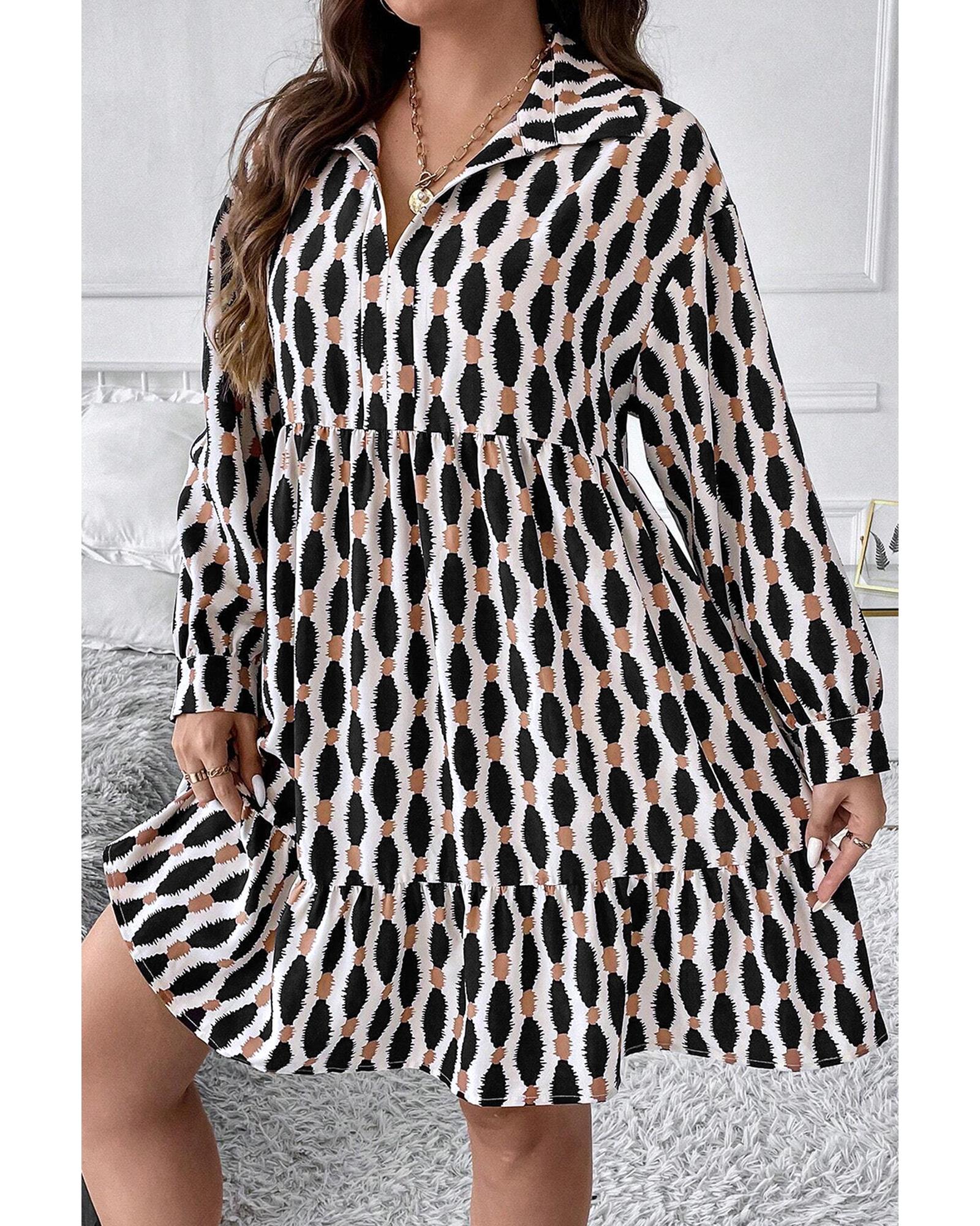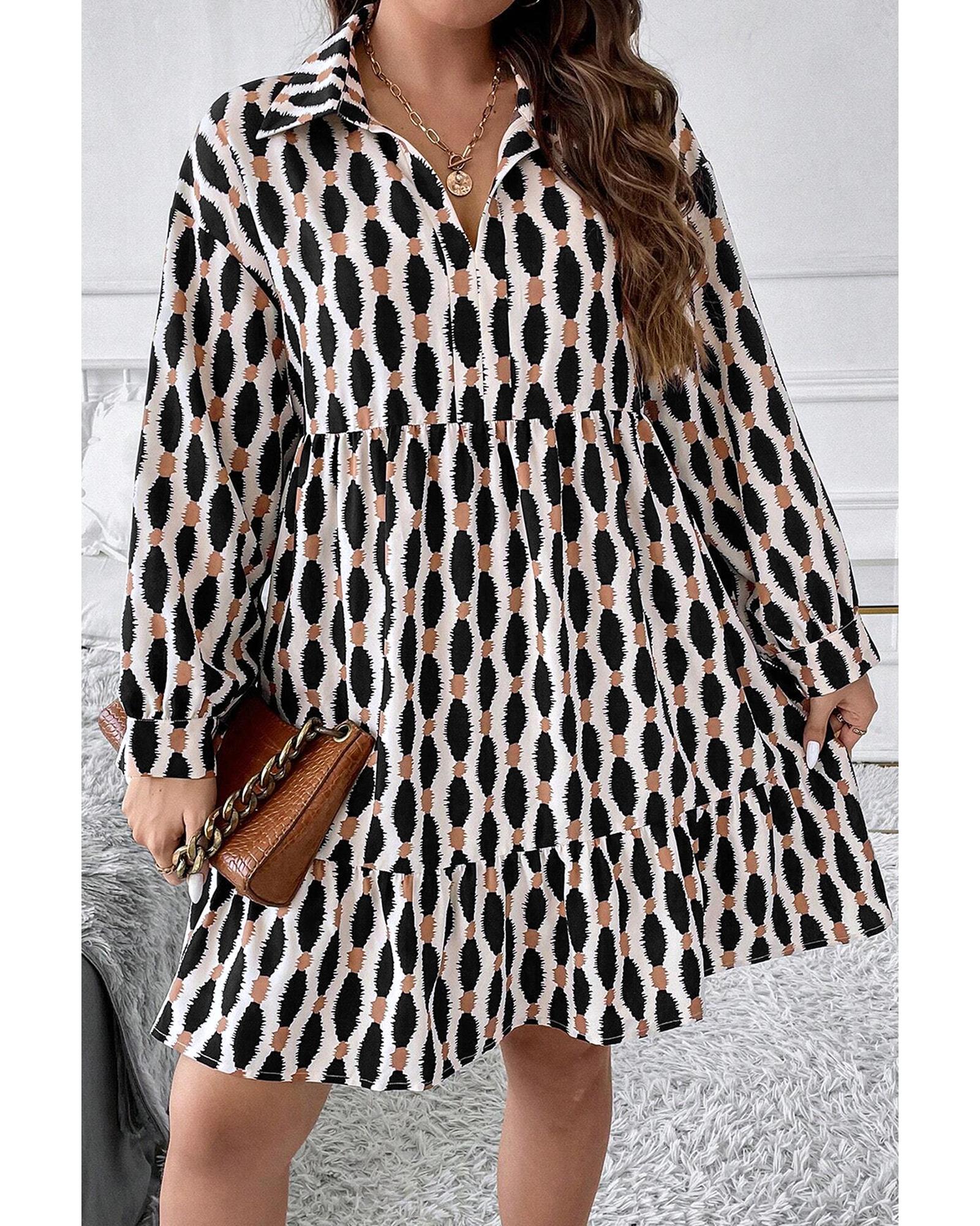 Apricot Geometric Print Collared V Neck Plus Size Mini Dress – 2X