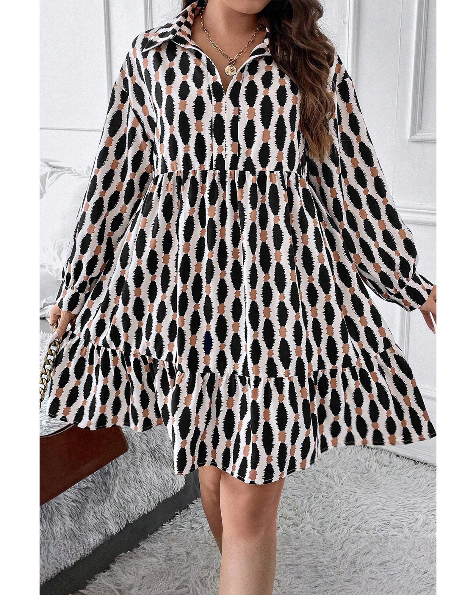 Apricot Geometric Print Collared V Neck Plus Size Mini Dress – 4X