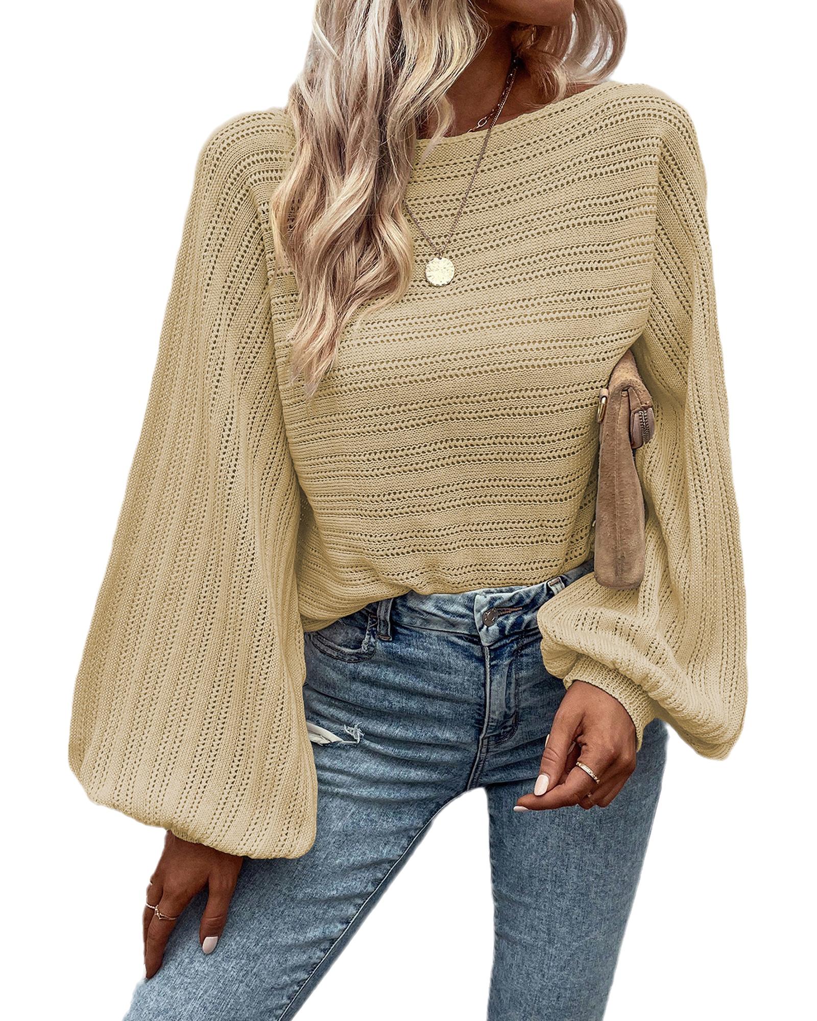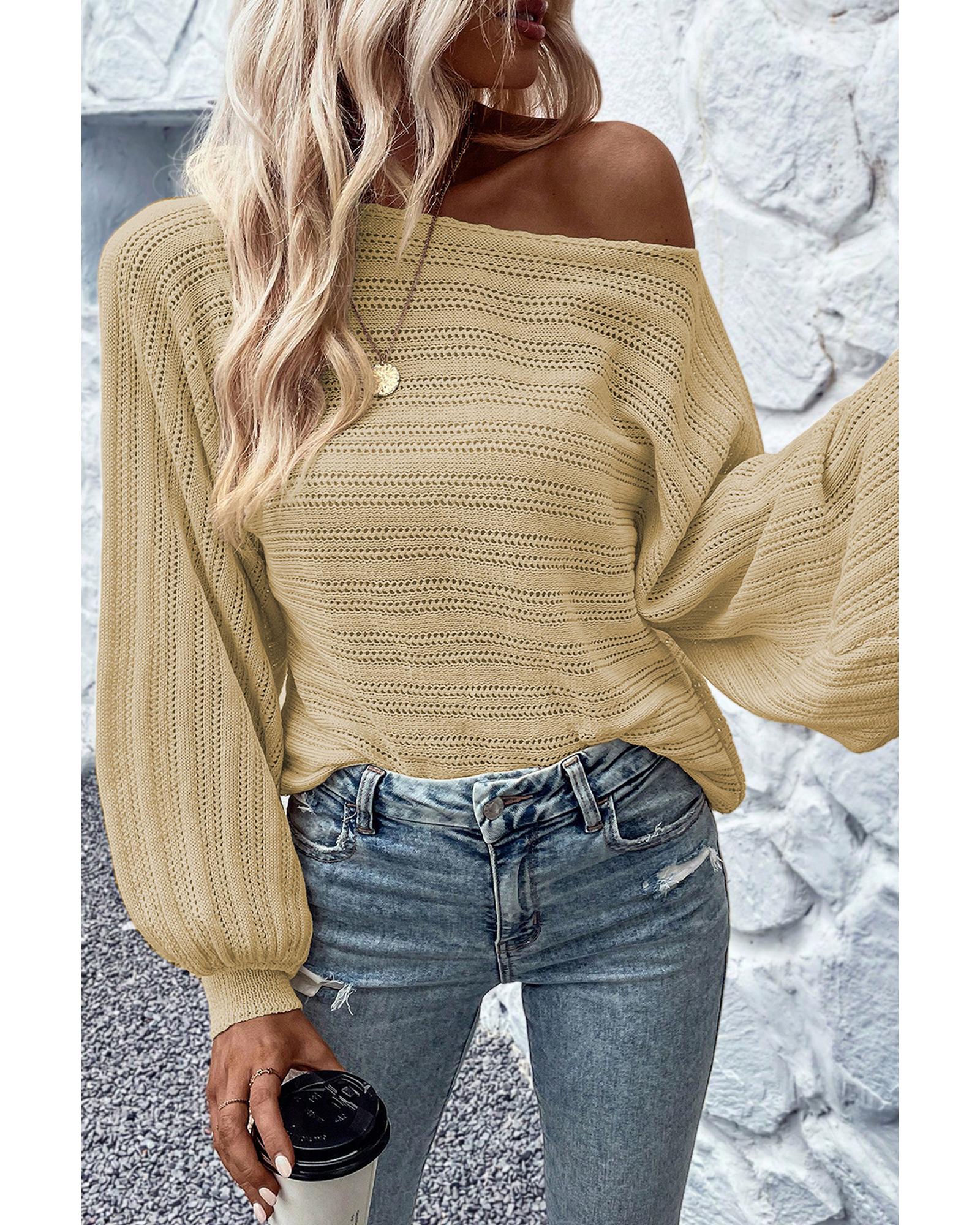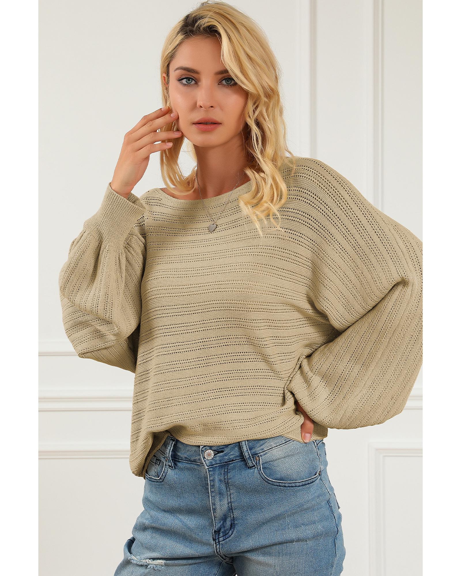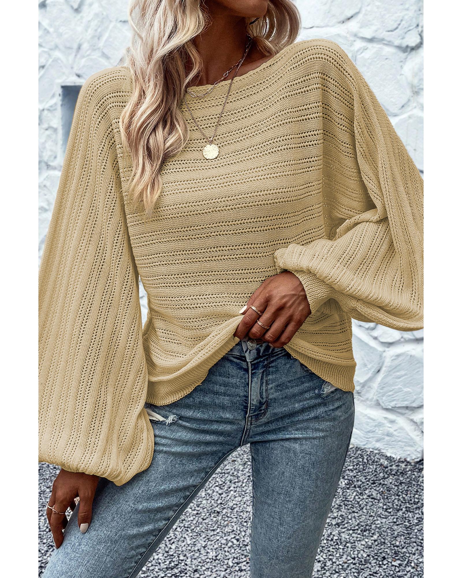 Apricot Lantern Sleeve Eyelets Textured Knit Sweater – M