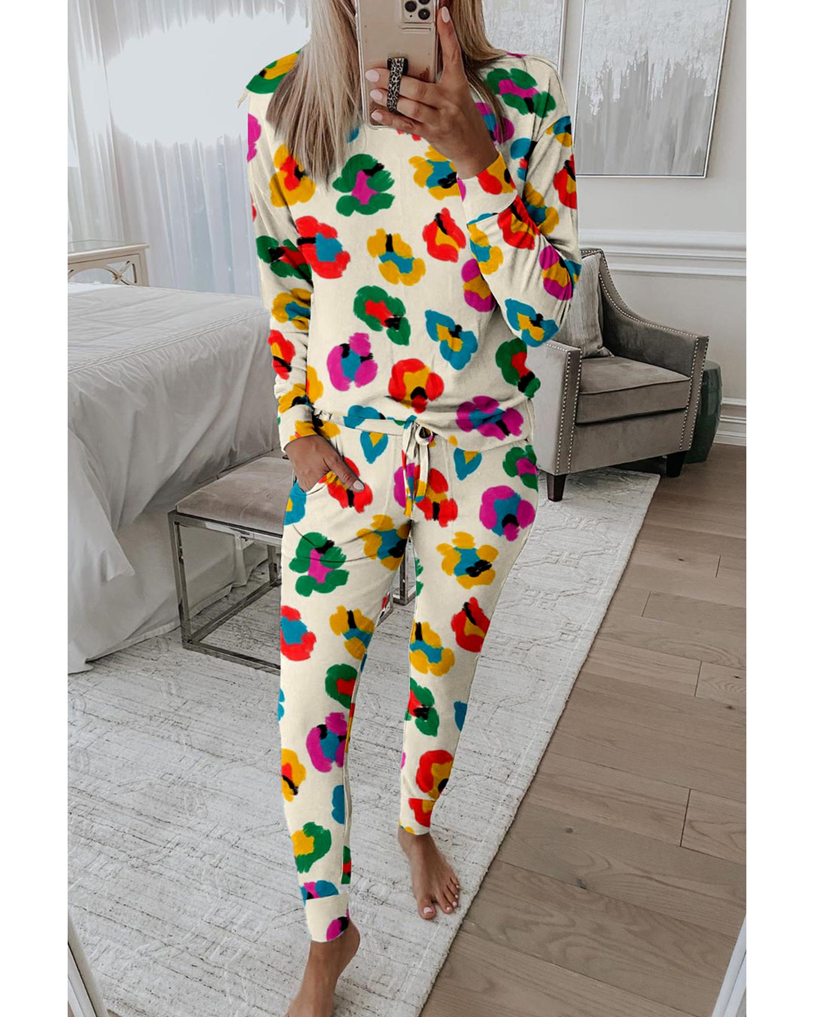 Apricot Leopard Print Long Sleeve Top and Skinny Pants Lounge Set – M