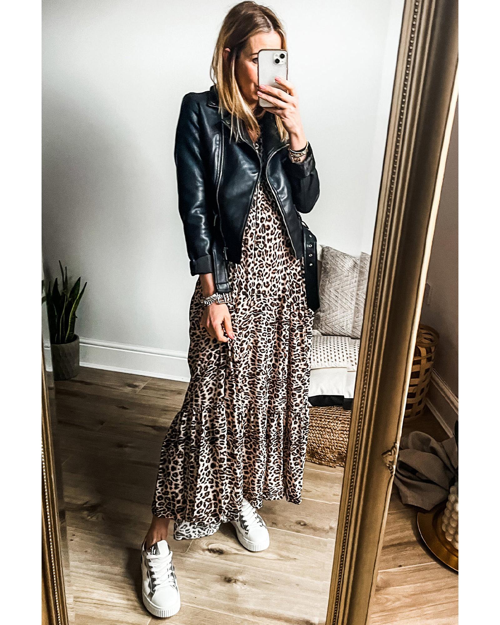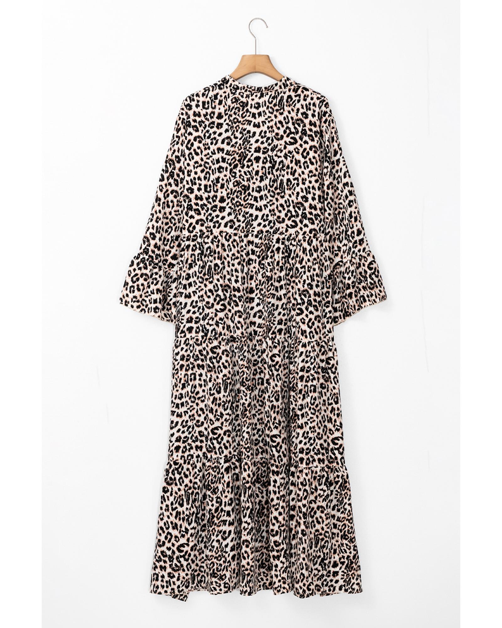 Apricot Leopard Print Tiered Wide Sleeve Maxi Dress – L
