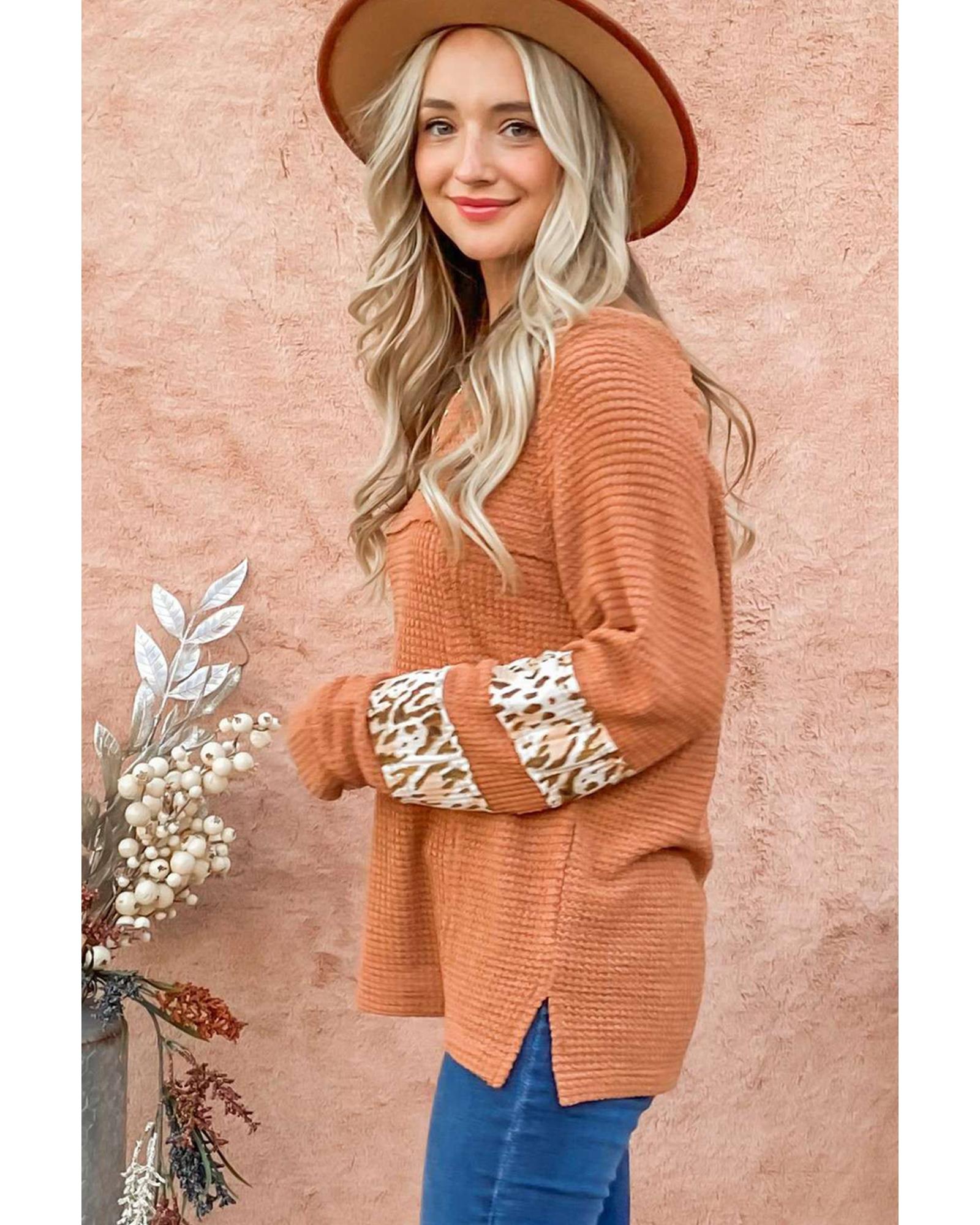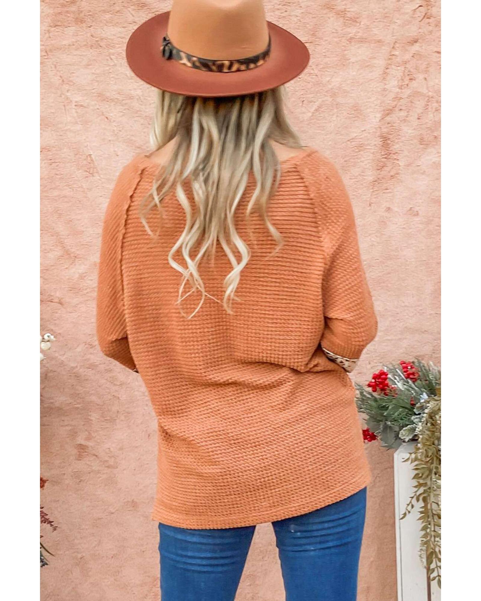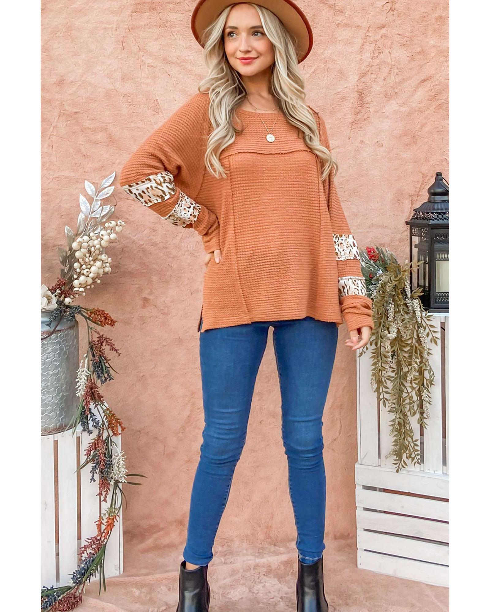 - Apricot Leopard Splicing Exposed Seam Waffle Knit Top