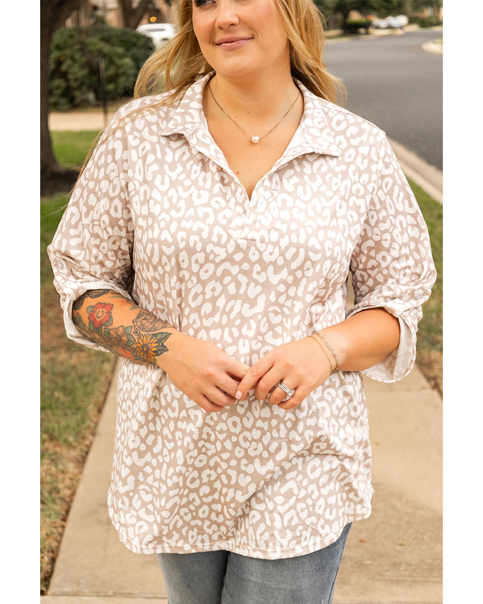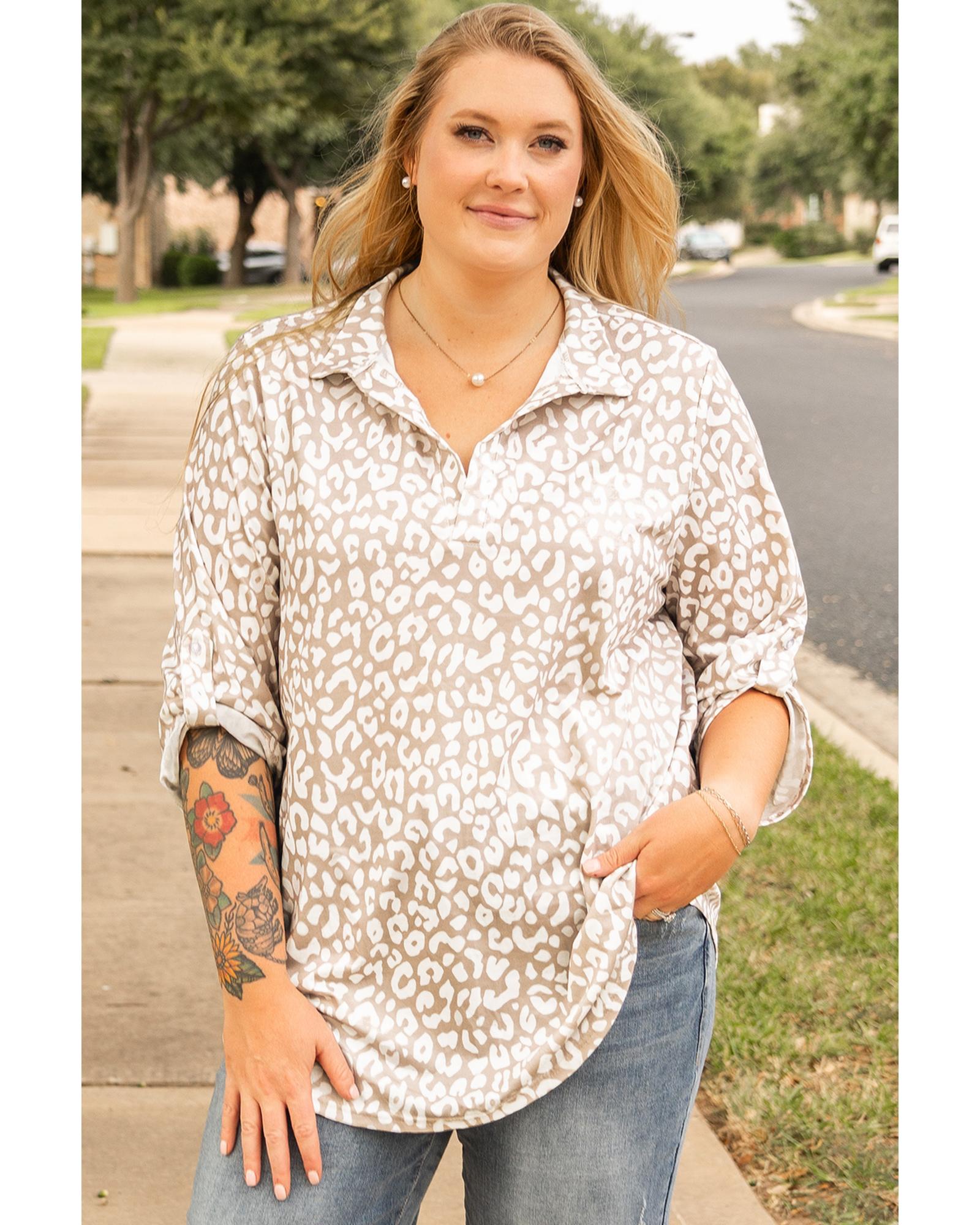 Apricot Leopard Tab Sleeve V Neck Plus Size Top - 1X