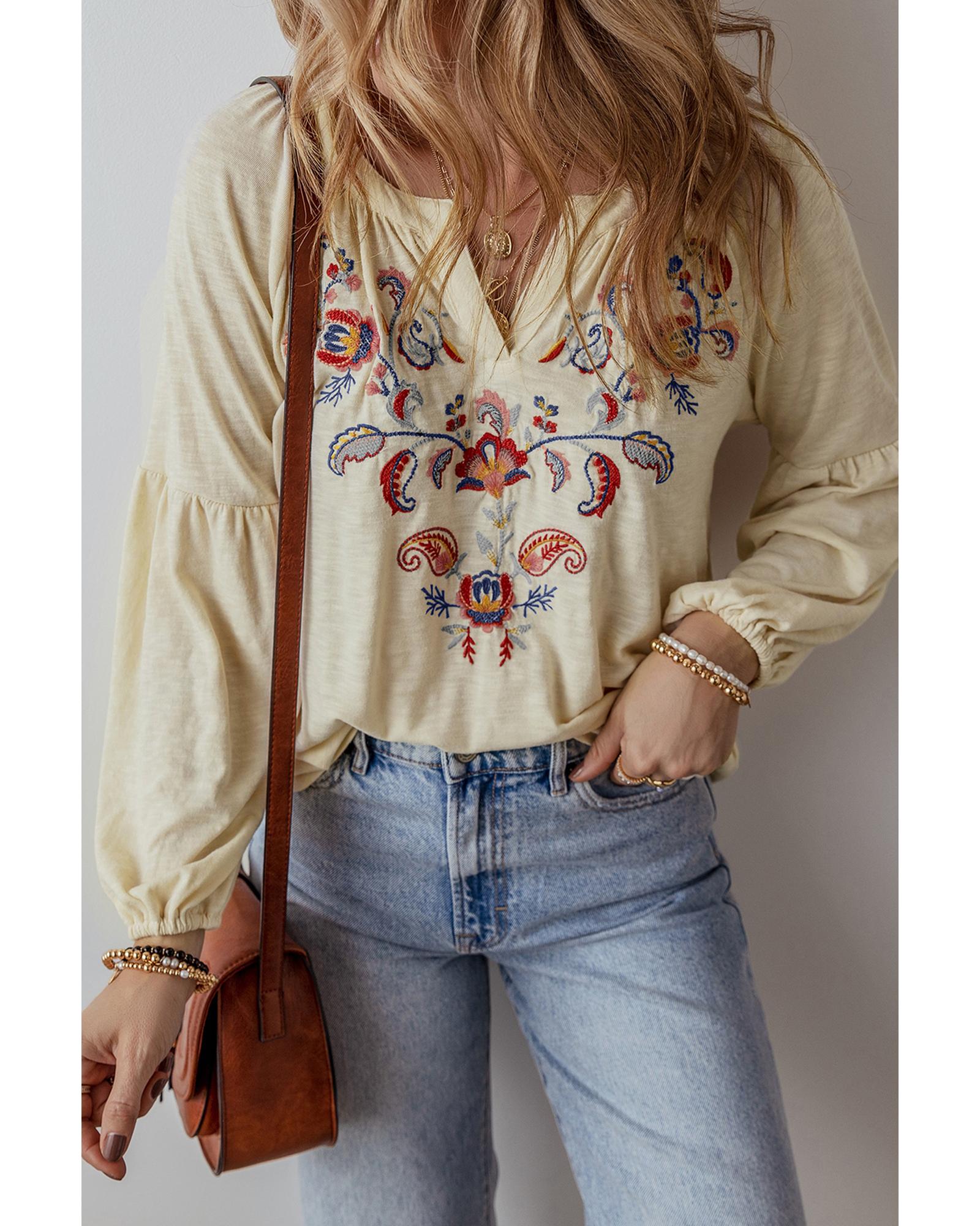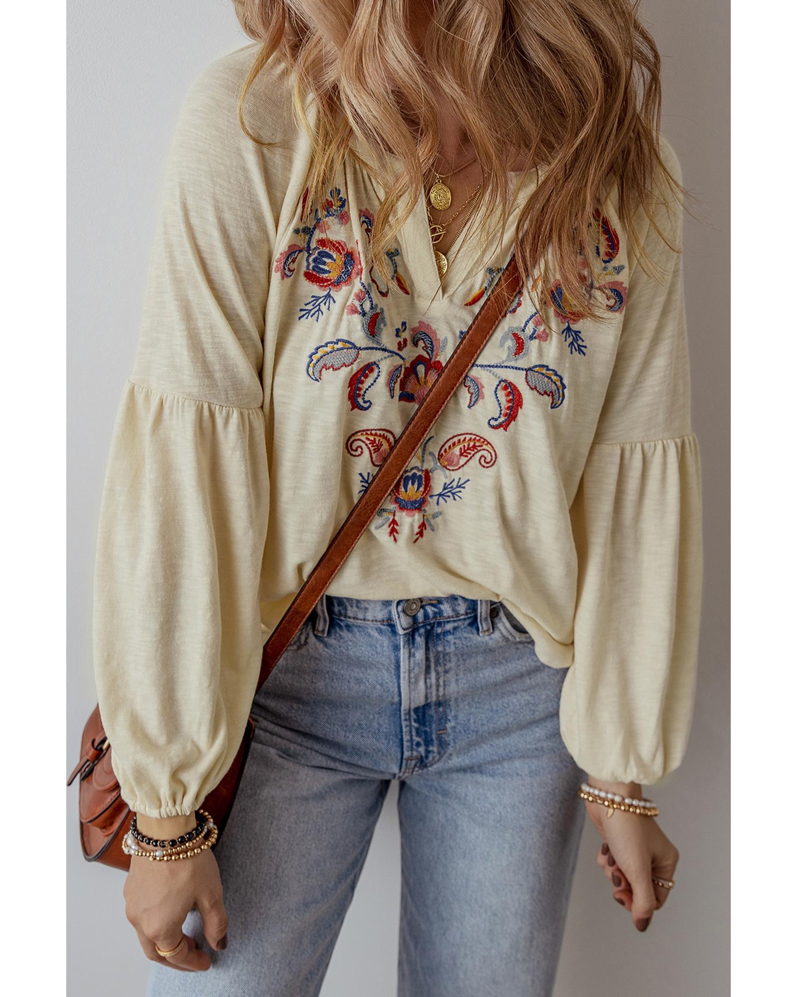Apricot Paisley Floral Embroidered Notch V Neck Blouse – M