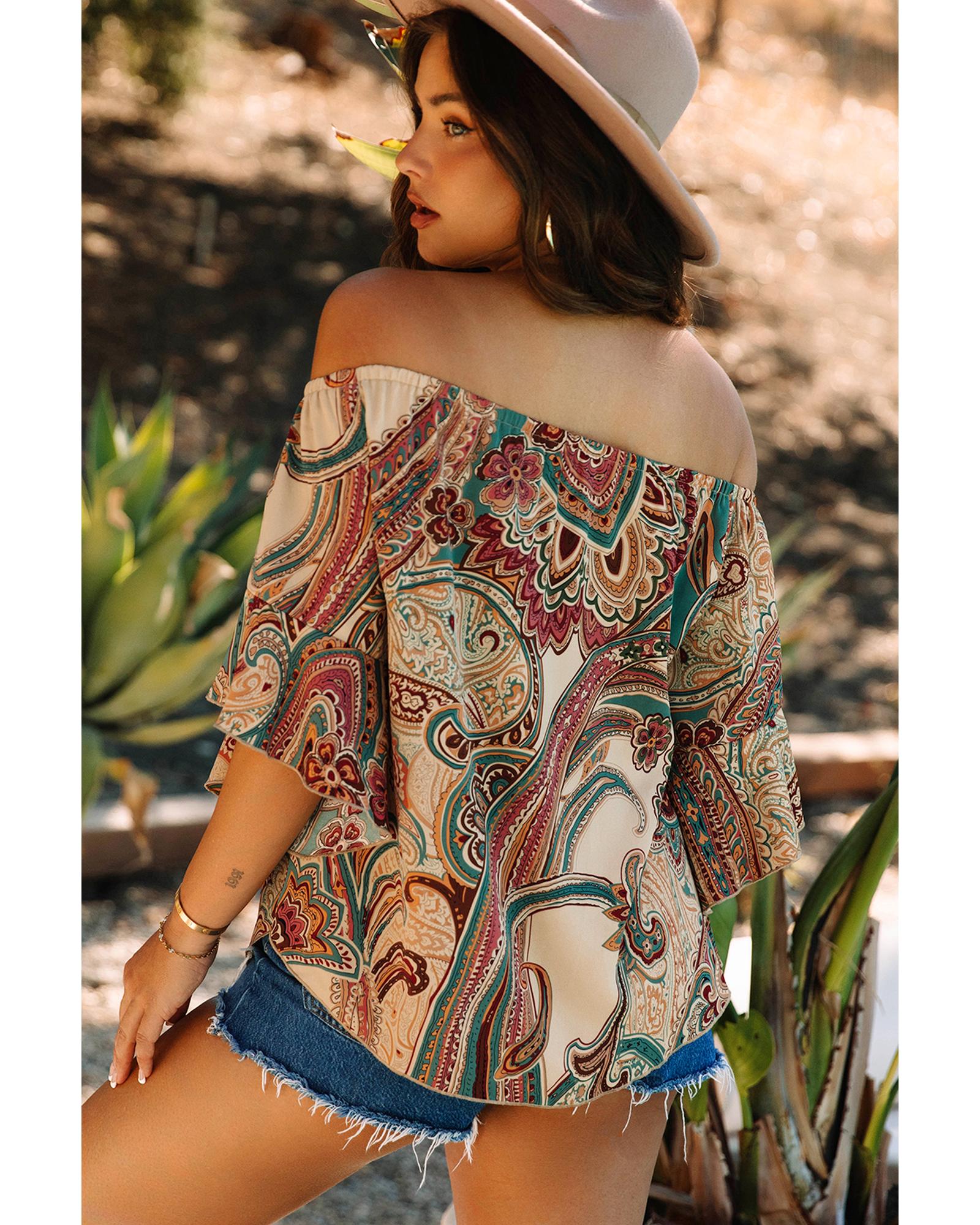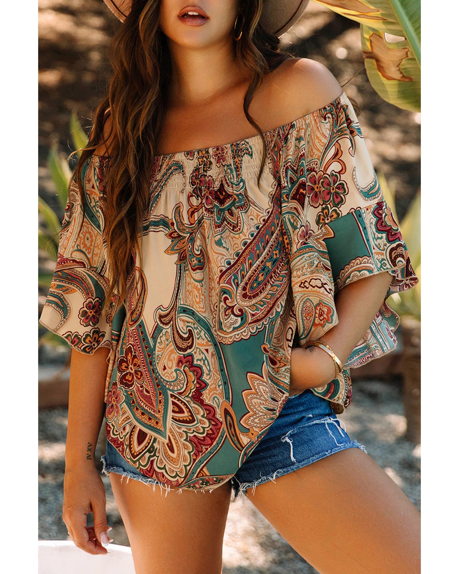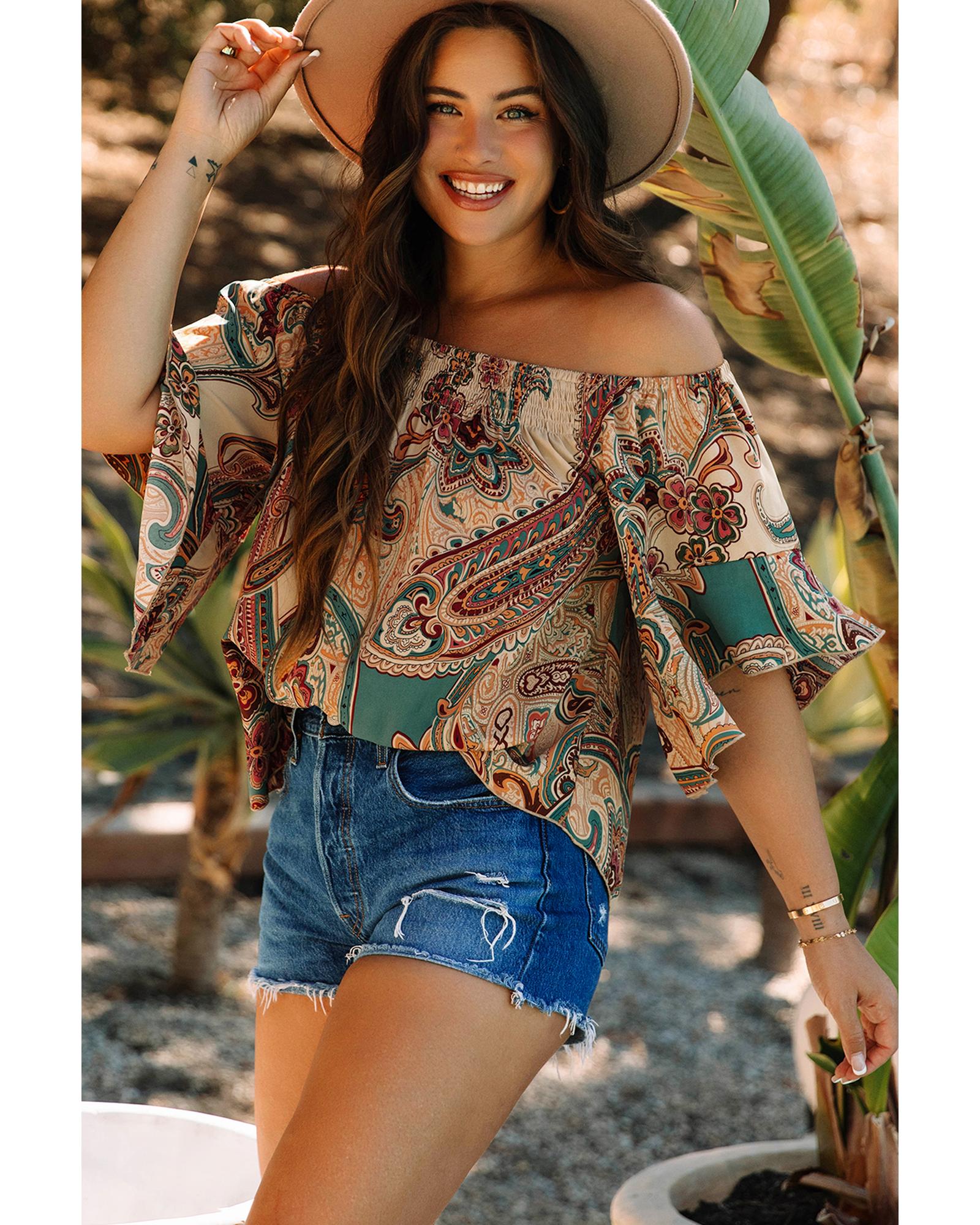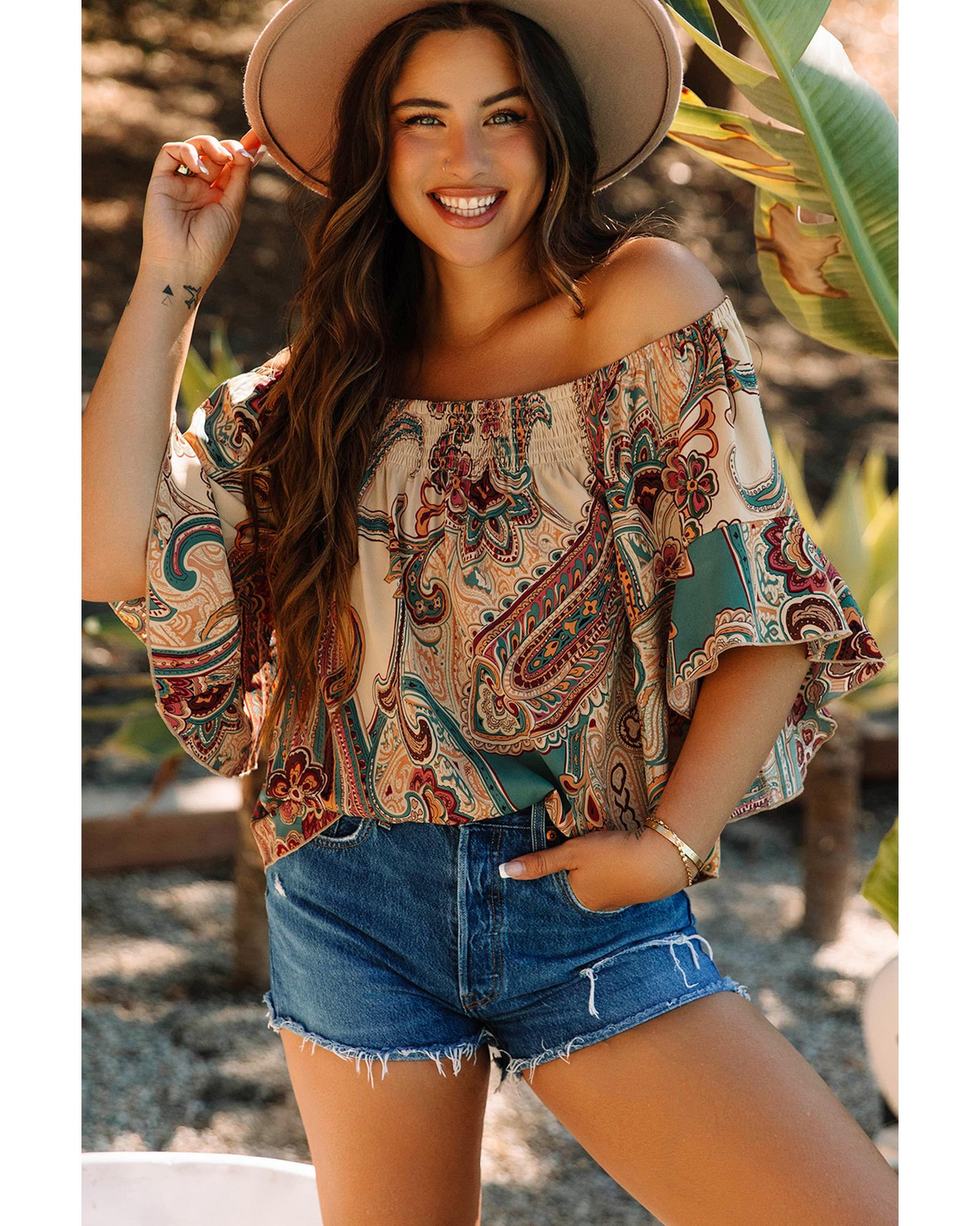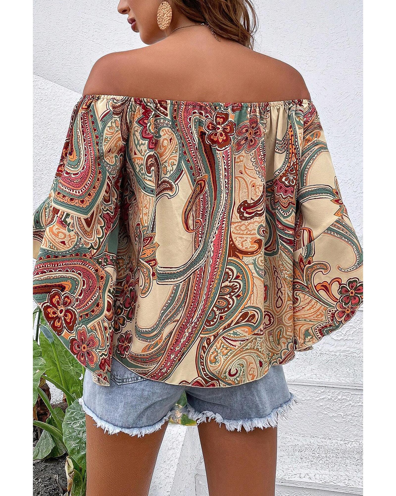 Apricot Paisley Printed Shirred Off Shoulder Ruffled Draped Sleeve Blouse – S