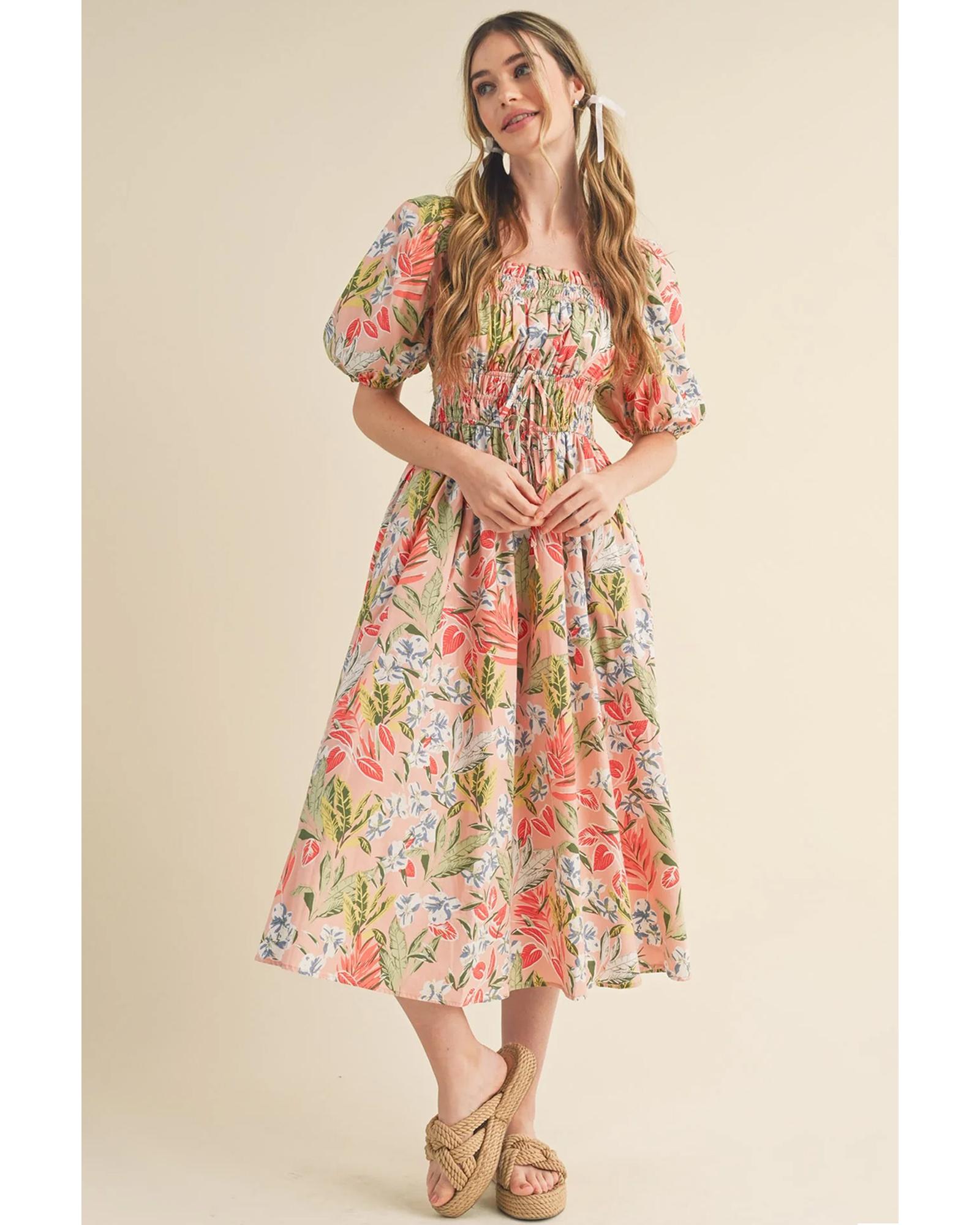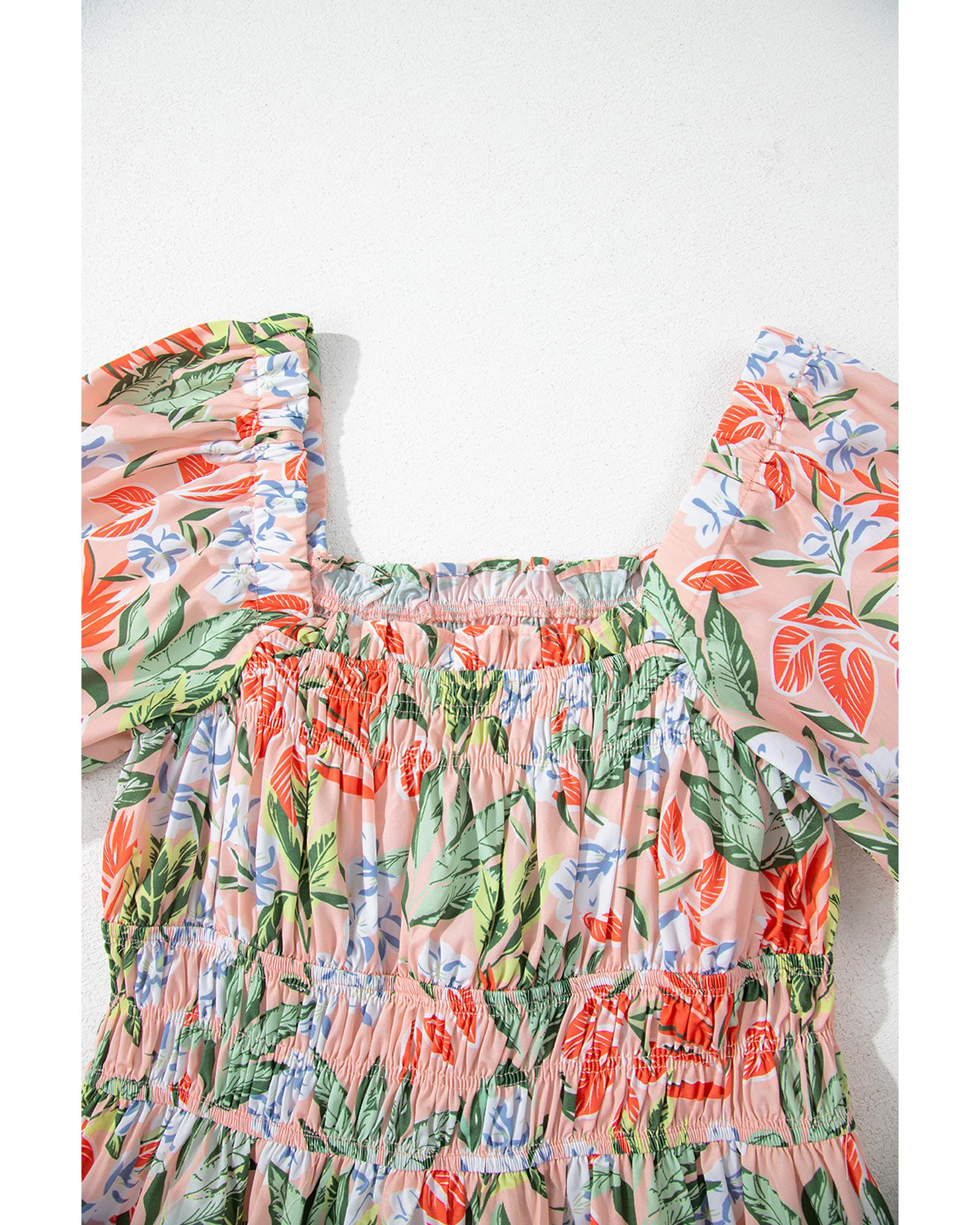 - Apricot Pink Floral Smocked Bust Bubble Short Sleeve Maxi Dress