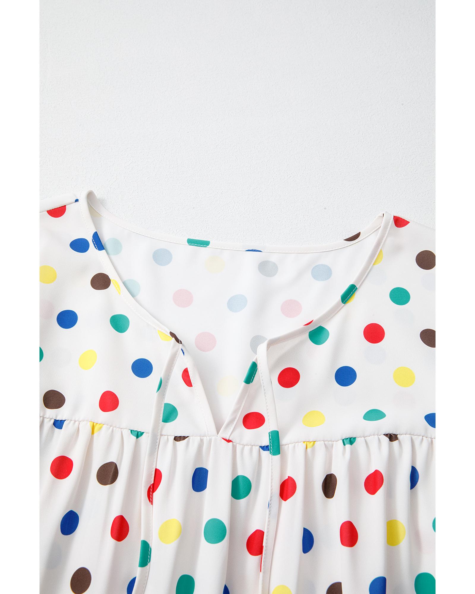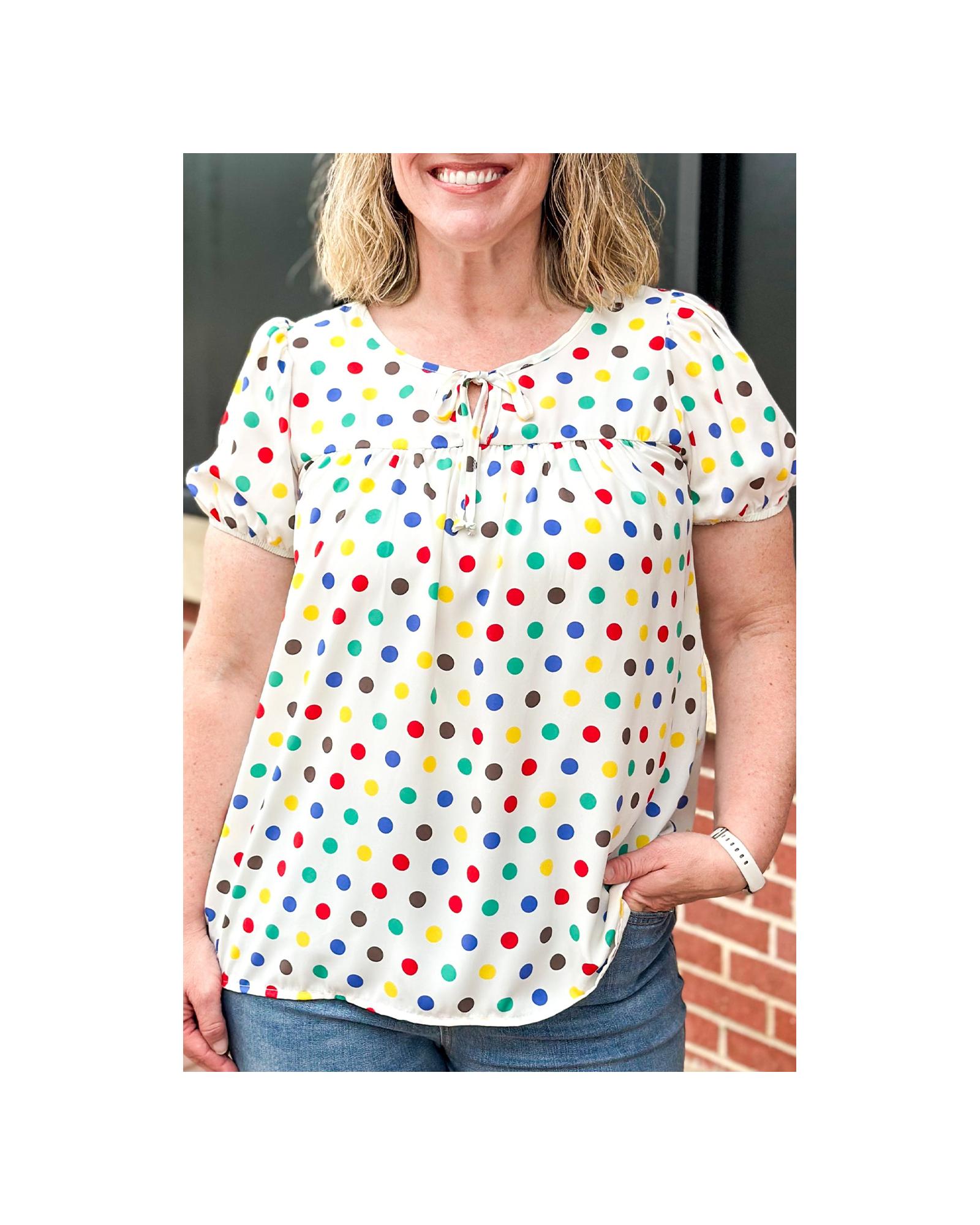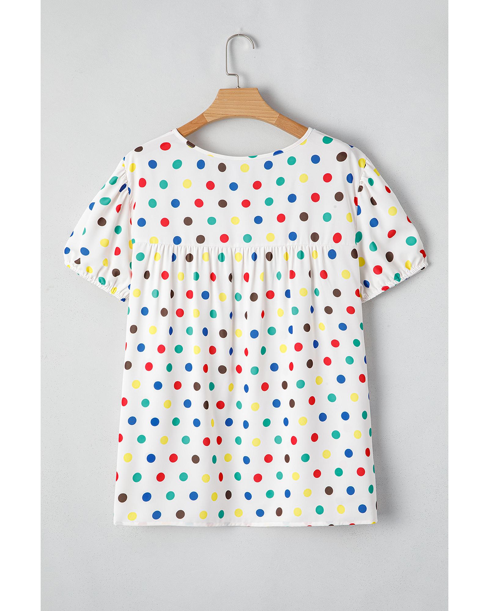 Apricot Plus Size Colorful Polka Dots Tie Neck Puff Sleeve Blouse – 1X