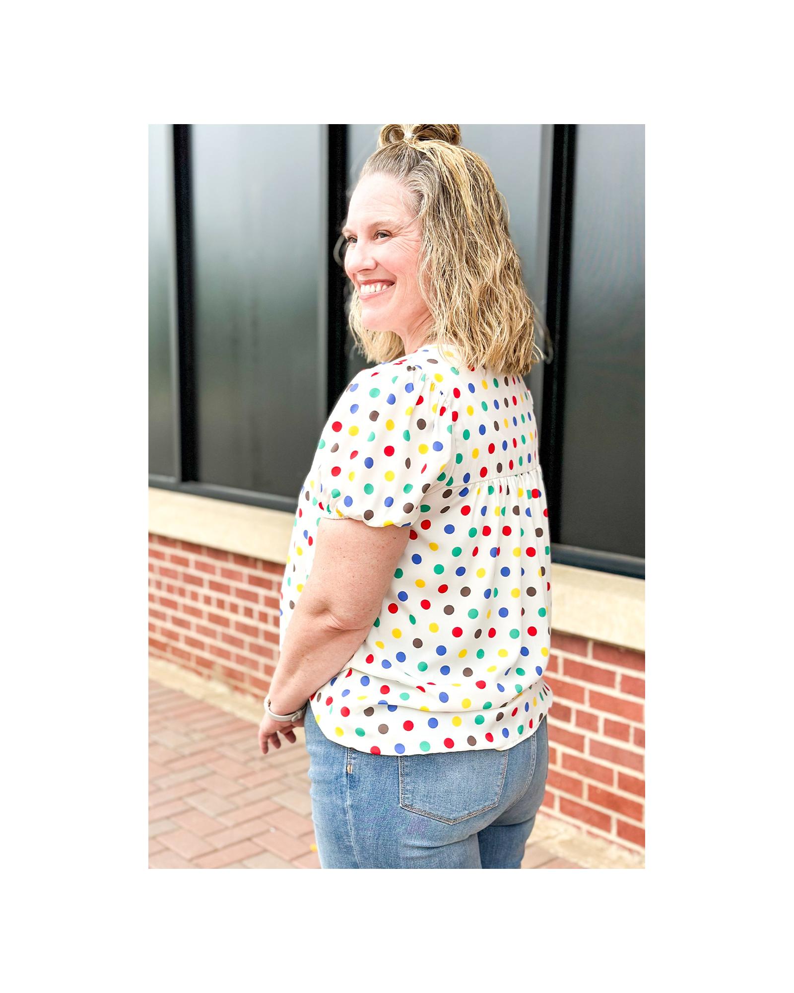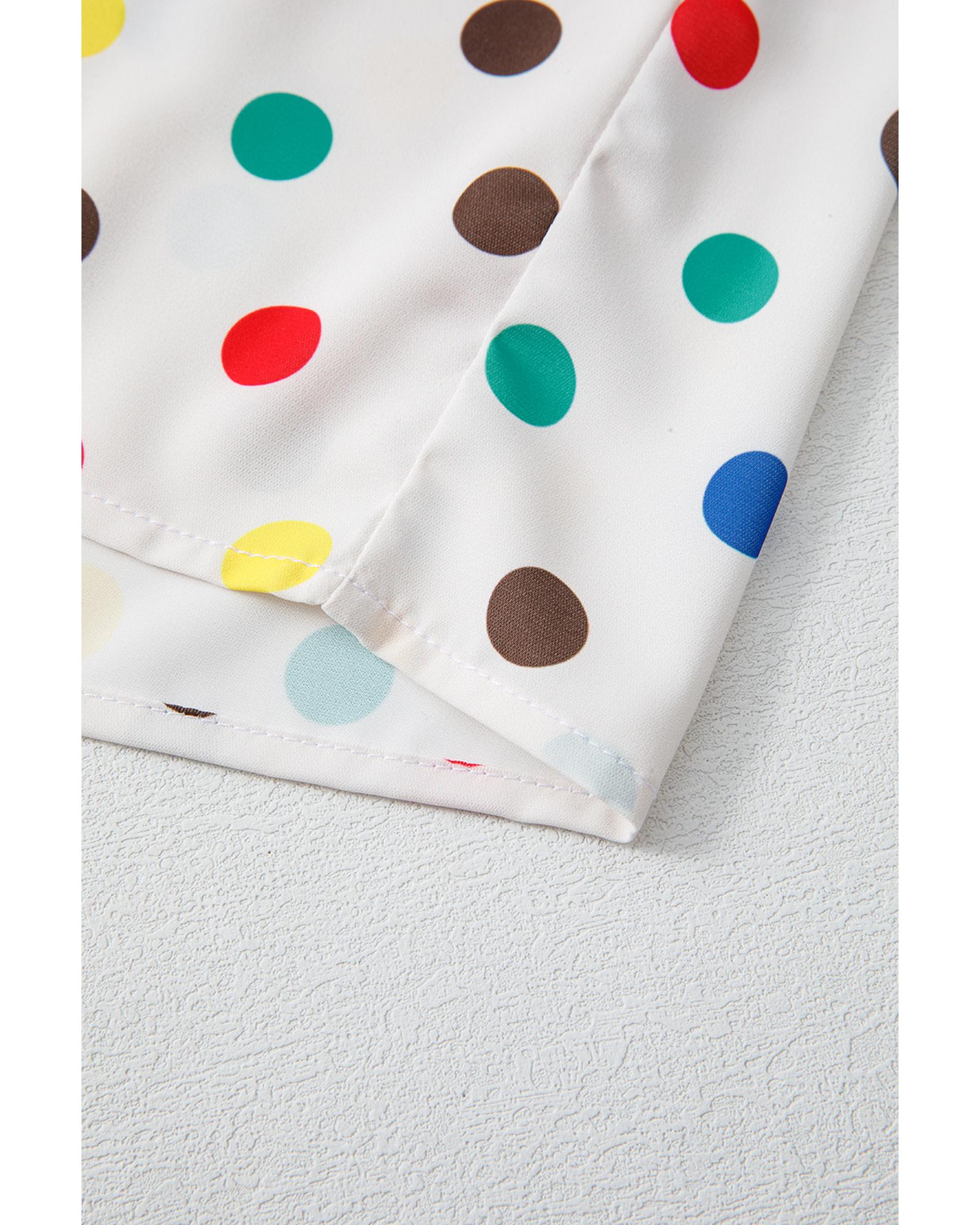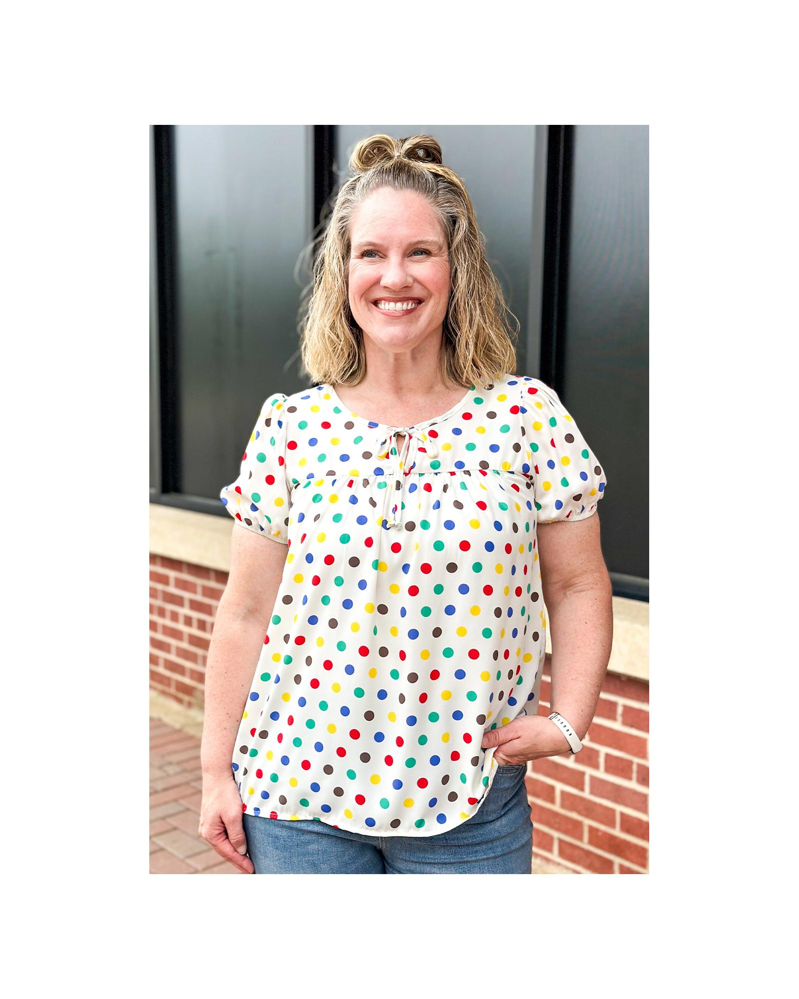 Apricot Plus Size Colorful Polka Dots Tie Neck Puff Sleeve Blouse – 1X